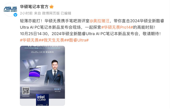 10月23日,華碩筆記本微博官宣,將在10月25日舉行“2024華碩全新酷睿Ultra AI PC筆記本新品發(fā)布會”,現(xiàn)場開箱搭載了第二代酷睿Ultra處理器的華碩無畏Pro14 AI超輕薄本。