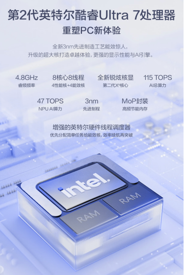 處理器可選第二代英特爾酷睿Ultra7,8核心8線程,最高睿頻可達4.8GHz。升級增強版NPU 4.0 AI 引擎,NPU AI算力提升至47 TOPS,相較上一代提升4倍。內(nèi)置英特爾銳炫高能核顯,由全新Xe2架構驅(qū)動,配合封裝的32GB 8533MHz高頻內(nèi)存和XeSS技術,游戲性能提升高達60%。CPU+NPU+GPU總AI算力高達115 TOPS,全面革新AI體驗。
