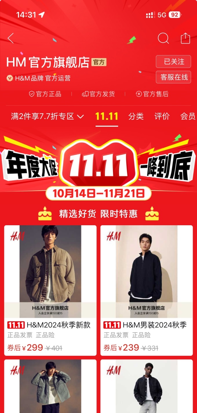 H&M拼多多官方旗艦店上線,首個(gè)雙11發(fā)放超額補(bǔ)貼
