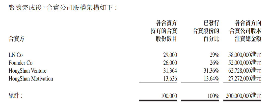 根據(jù)公告,合資公司的股本總額為2億港元,其中LN Co、Founder Co、HongShan Venture及 HongShan Motivation將分別以現(xiàn)金注資5800萬港元、5200萬港元、6272.8萬港元及2727.2萬港元,并分別占合資公司股本總額之29%、26%、31.36%及13.64%。