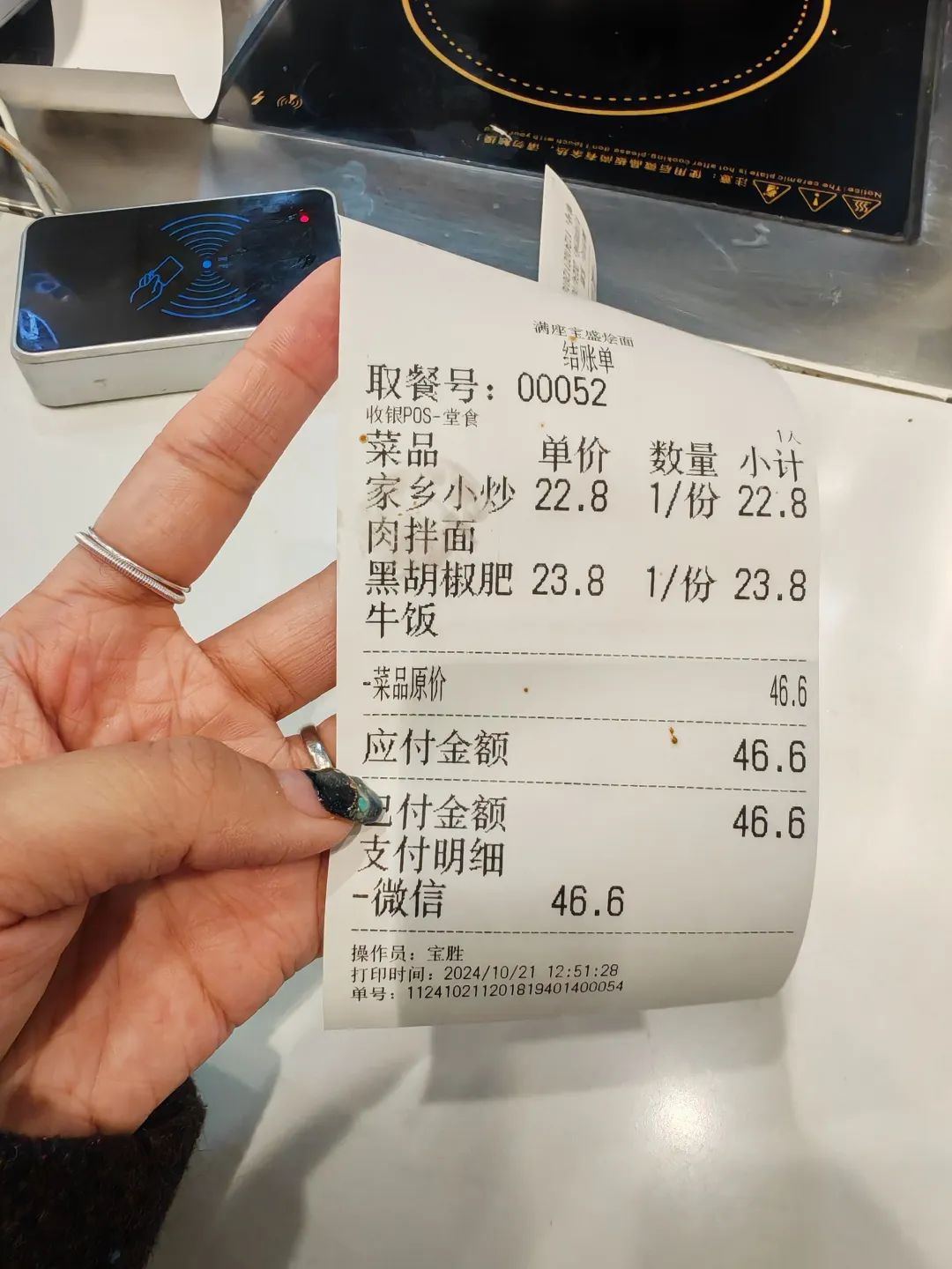 特色檔口售賣價格差不多同快餐店一樣,比如職餐記者點了一份牛肉飯,價格在23.8元,一份新疆拌面價格在22.8元。