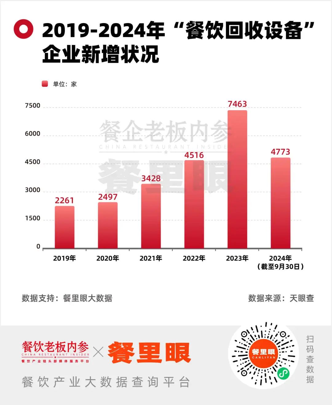 據(jù)天眼查數(shù)據(jù),搜索“餐飲收回設(shè)備”的關(guān)鍵詞,2019年-2023年里新增企業(yè)數(shù)量每年都在上漲,并在去年創(chuàng)造了更高峰。入局者變多,這個行業(yè)也像餐飲業(yè)本身一樣,“輕松賺錢”的時代不再。