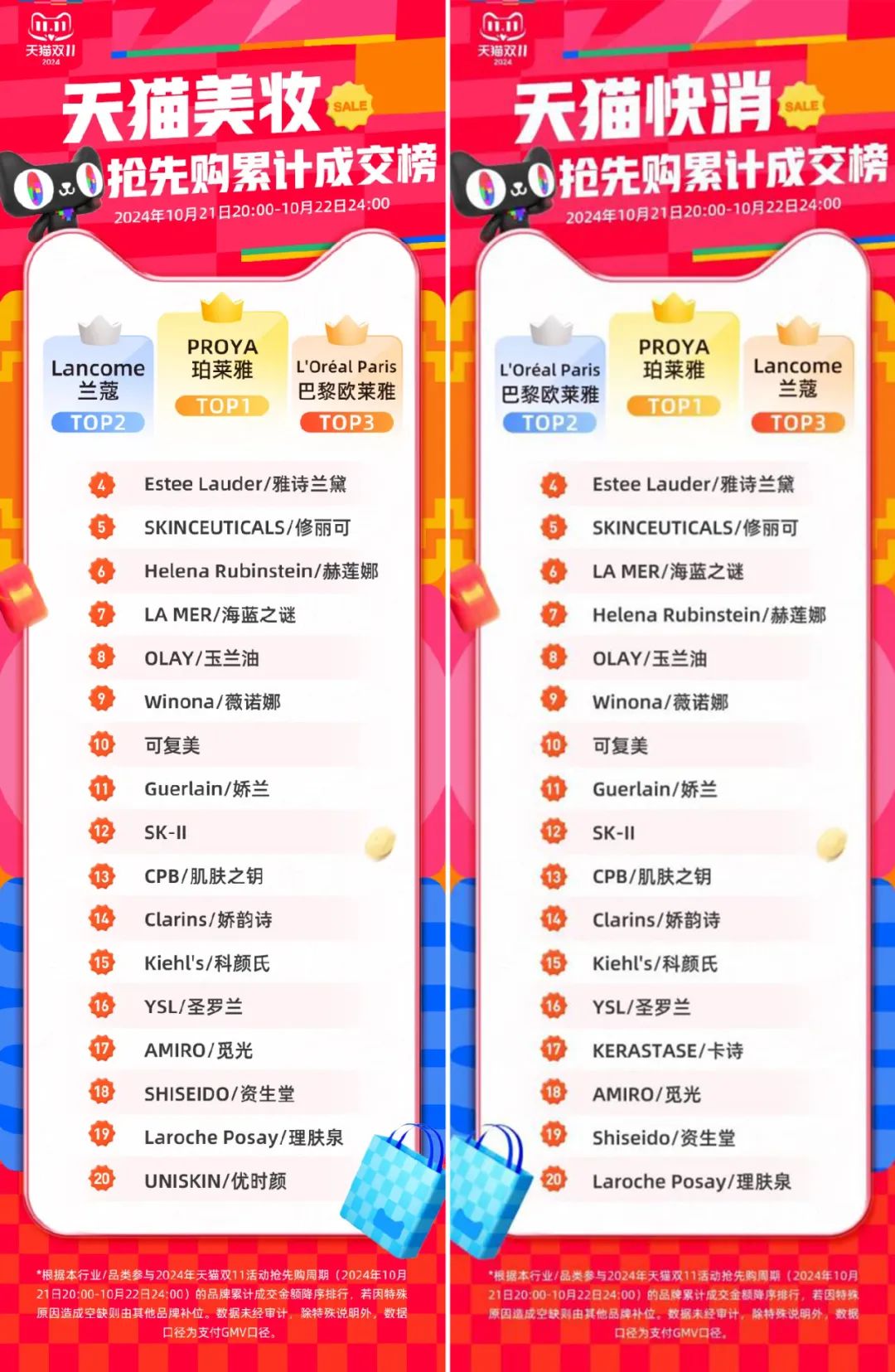 就天貓大美妝今日(10月23日)最新公布的銷售榜單來看,在“天貓美妝搶先購累計成交榜”(10月21日20:00-10月22日24:00)中,盡管國貨品牌珀萊雅占據(jù)第一,但歐萊雅集團在前三名中占據(jù)了兩個席位(巴黎歐萊雅、蘭蔻),前20中共有7個品牌闖入榜單(巴黎歐萊雅、蘭蔻、修麗可、赫蓮娜、科顏氏、YSL、理膚泉)。
