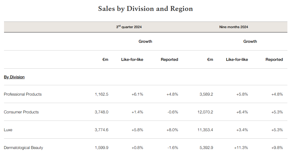 當(dāng)?shù)貢r間10月22日,歐萊雅集團最新公布2024年前三季度業(yè)績情況,財報顯示,今年前三季度(1-9月),歐萊雅集團實現(xiàn)總銷售額324.06億歐元(約合人民幣2491.9億元),同比增長6%。其中,第三季度實現(xiàn)銷售額102.85億歐元(約合人民幣790.9億元),同比增長3.4%。