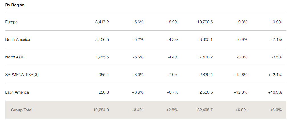 北亞地區(qū)表現(xiàn)不盡如人意,銷售額同比下滑3%至74.3億歐元(約合人民幣571億元)。上半年北亞地區(qū)僅下滑1.7%,如今看來跌幅仍在擴大,第三季度銷售額同比下滑了6.5%。