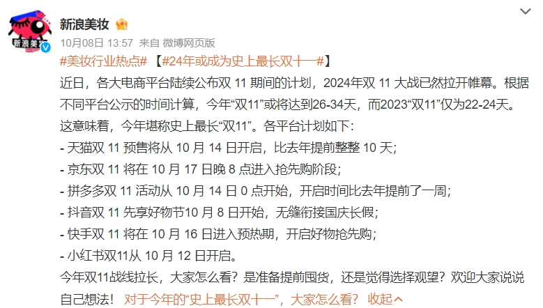 根據(jù)不同電商平臺(tái)公示的時(shí)間計(jì)算,今年“雙11”或?qū)⑦_(dá)到26-34天,而2023雙11僅為22-24天。這些平臺(tái)的行動(dòng)也標(biāo)志著,今年雙十一成為了“史上最早雙11”,并且也是跨時(shí)最長(zhǎng)的一屆雙11。