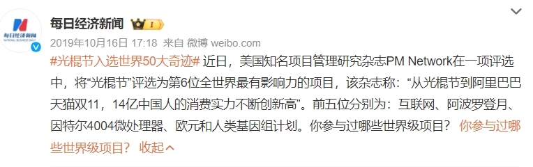 2019年10月,美國(guó)知名項(xiàng)目管理研究雜志《PM Network》評(píng)選出“全球最具影響力的50個(gè)項(xiàng)目”,“雙11購(gòu)物節(jié)”與互聯(lián)網(wǎng)、阿波羅登月、人類基因組計(jì)劃等共同入選,位列第六。該雜志指出,這場(chǎng)狂歡從根本上改變了人們的購(gòu)物方式,打通了購(gòu)物和娛樂(lè)之間的界限。