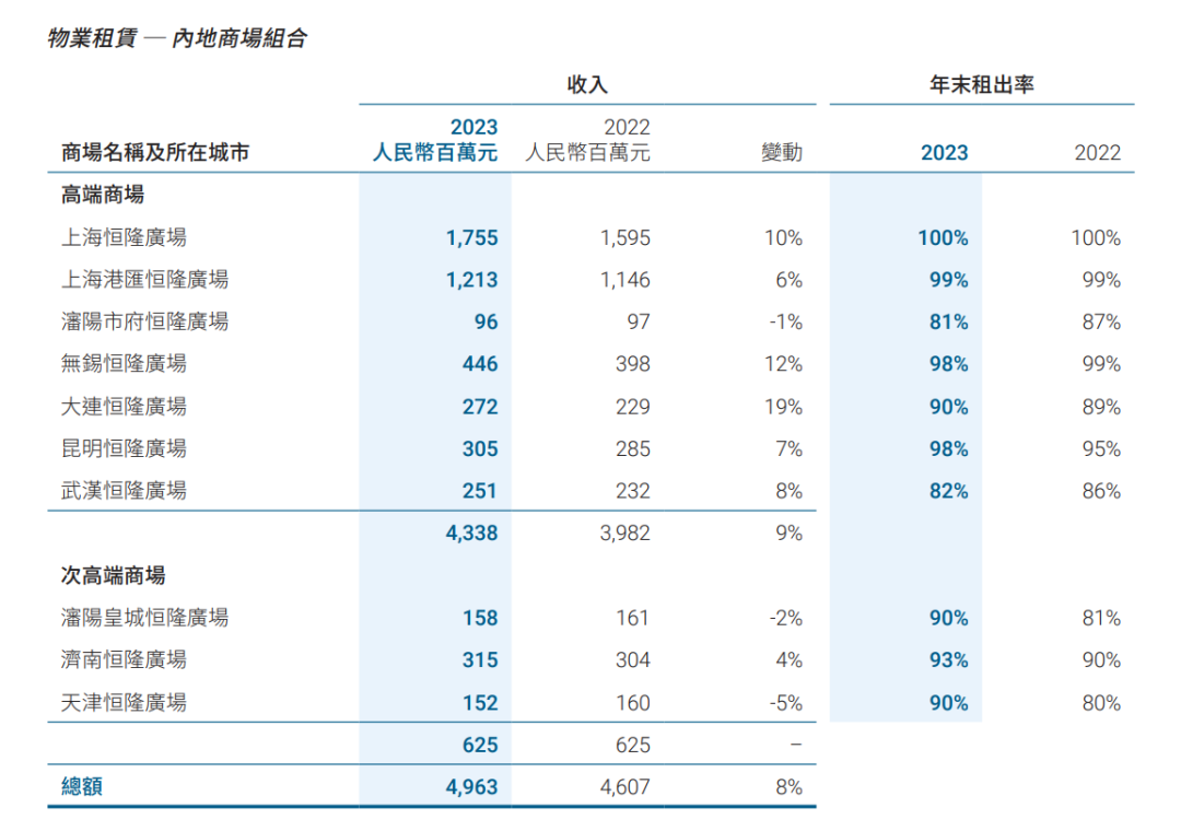 根據(jù)恒隆地產(chǎn)2023年財報顯示,沈陽市府恒隆廣場的租賃收入為9600萬,較上一年下滑了1%,出租率也由2022年的87%下滑至81%。