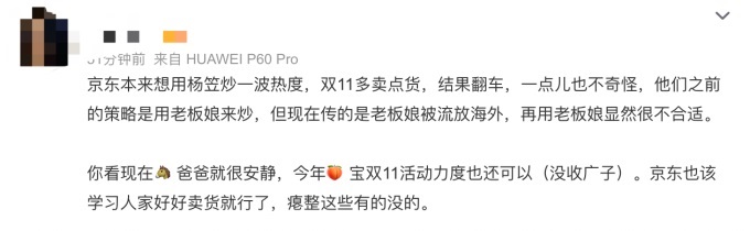 京東邀請以“冒犯男性”著稱的楊笠參加雙十一營銷活動,顯然觸怒了大量男性消費(fèi)群體,他們紛紛在京東店鋪、社交平臺上表達(dá)自己的不滿,還疑似引發(fā)了退款退會員等抵制行為。對于“請錯”代言人,有人質(zhì)疑京東故意炒作,也有人罵京東此舉“雞賊”,既想要流量,又不愿承擔(dān)被反噬的結(jié)果。