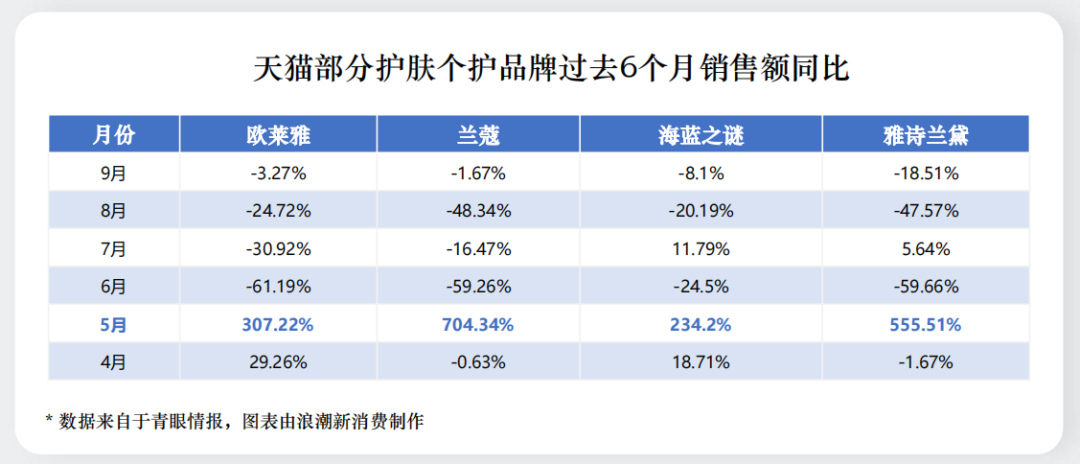 除了大盤(pán)跌跌不休,天貓美妝不少頭部品牌的銷量也在持續(xù)下滑,歐萊雅、海藍(lán)之謎、蘭蔻、雅詩(shī)蘭黛等銷售額TOP的品牌幾乎每個(gè)月同比都在大幅下挫。