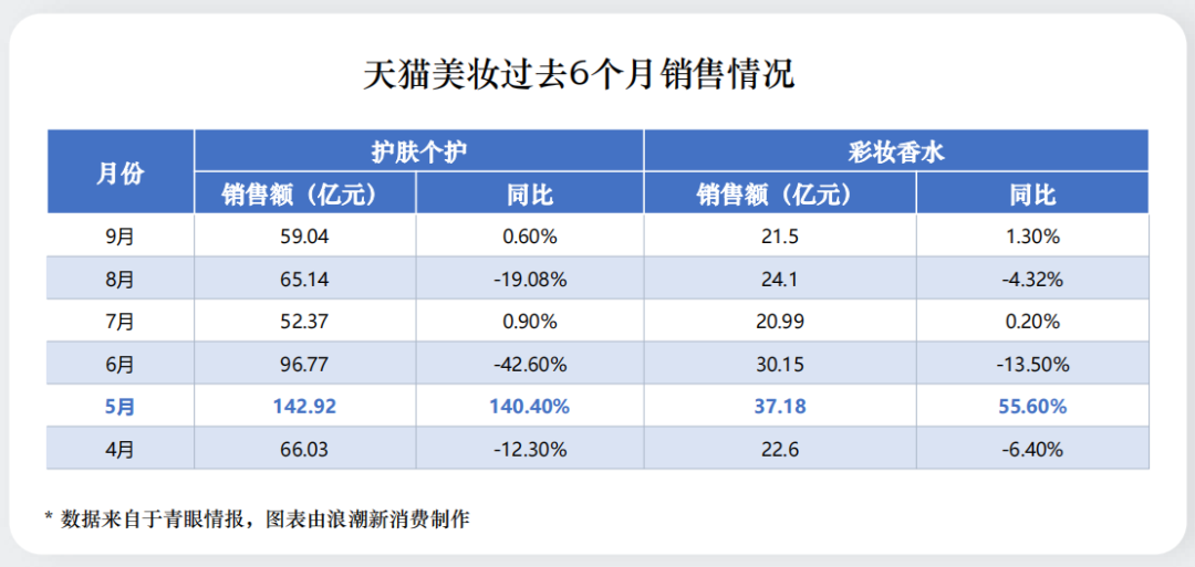 據(jù)青眼情報(bào)數(shù)據(jù),過(guò)去六個(gè)月中,天貓護(hù)膚個(gè)護(hù)品類和彩妝香水品類有3個(gè)月都同比出現(xiàn)了較為明顯的負(fù)增長(zhǎng),有兩個(gè)月勉強(qiáng)持平,除了大促節(jié)點(diǎn)外,負(fù)增長(zhǎng)已成為常態(tài)。