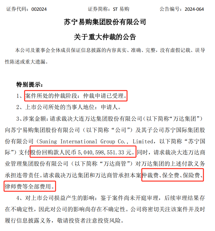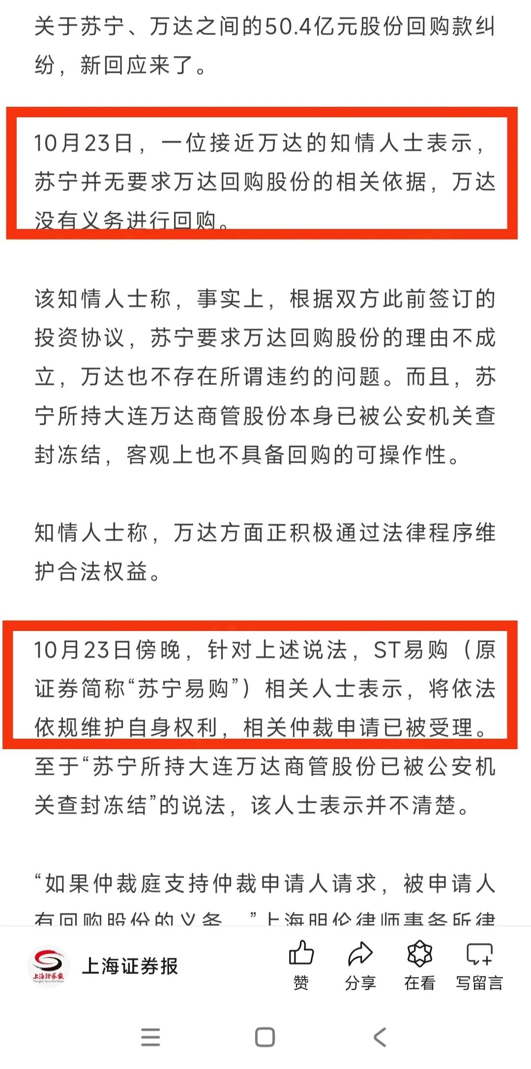今年10月22日,蘇寧易購發(fā)布公告稱,請(qǐng)求裁決大連萬達(dá)集團(tuán)股份有限公司(簡稱“萬達(dá)集團(tuán)”)向蘇寧易購集團(tuán)股份有限公司及其子公司蘇寧國際集團(tuán)股份有限公司(簡稱“蘇寧國際”)支付股份回購款人民幣50.4億元。