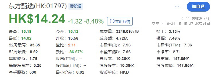 財(cái)報(bào)一出,東方甄選港股就開始下跌,截至發(fā)稿,東方甄選跌超8.48%,總市值為147.85億港元。