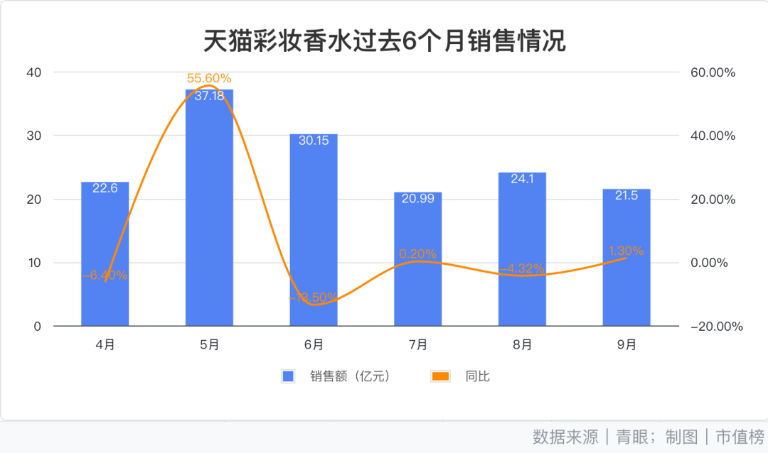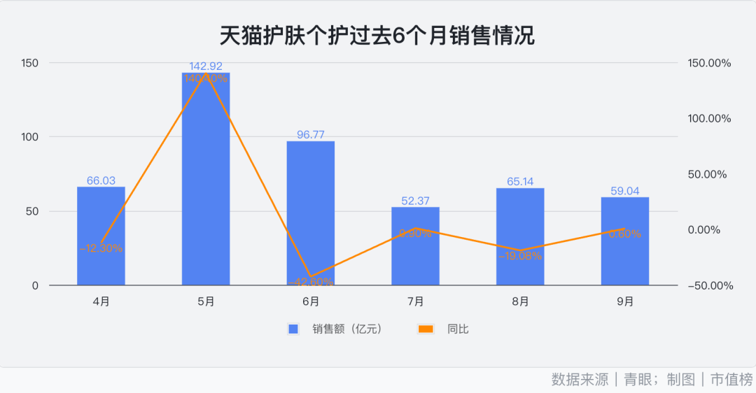 天貓美妝銷售額也在下滑。據(jù)青眼數(shù)據(jù),今年4月-9月,除5月份受618影響外,其他五個月天貓護膚個護和彩妝香水均處于大幅下跌,即使增長,最高增幅也不到2%。