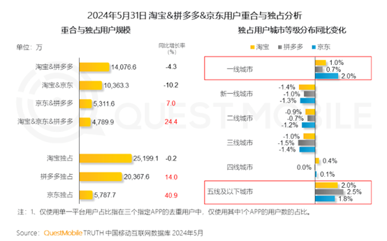京東和淘寶握手言和,也基于類似的邏輯。QuestMobile數(shù)據(jù)顯示,2024年5月,京東和淘寶的用戶畫像有較大差異。其中,京東在高線市場擁有更大的影響力,而淘寶則在低線市場占優(yōu)。