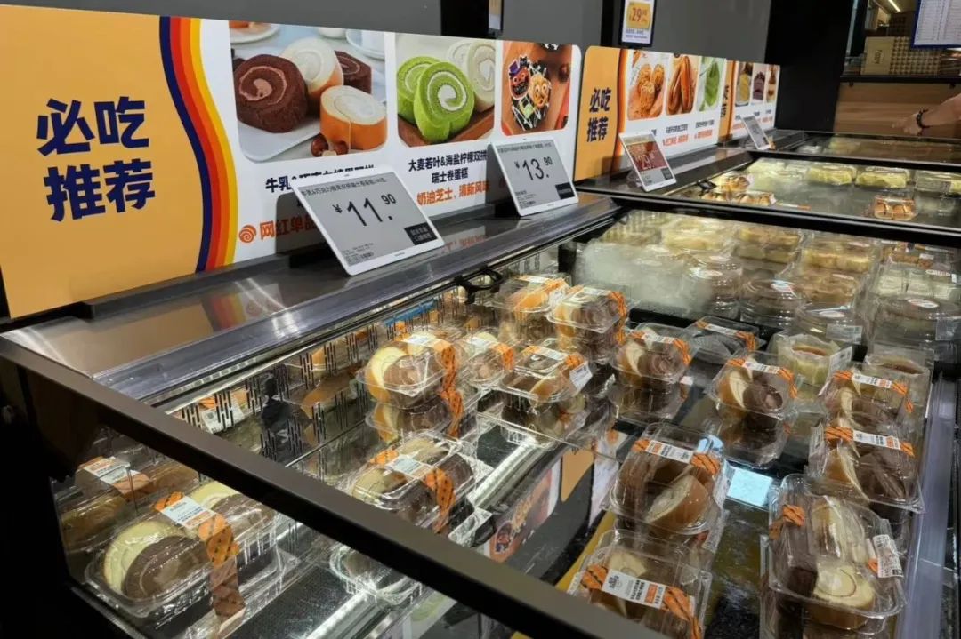 令人眼前一亮的是,金山首店還設(shè)置了甜品蛋糕柜,里面除了類似網(wǎng)紅爆款的甜點(diǎn),如提拉米蘇、榴蓮千層、瑞士卷外,還有上海風(fēng)味的甜點(diǎn),如栗子牛乳蛋糕、牛乳小方蛋糕。這兩樣是上海老牌烘焙店凱司令和紅寶石的熱銷款,幾十年來深受上海人民的喜愛?梢,自有單品研發(fā)方面,奧樂齊的確是下了功夫。