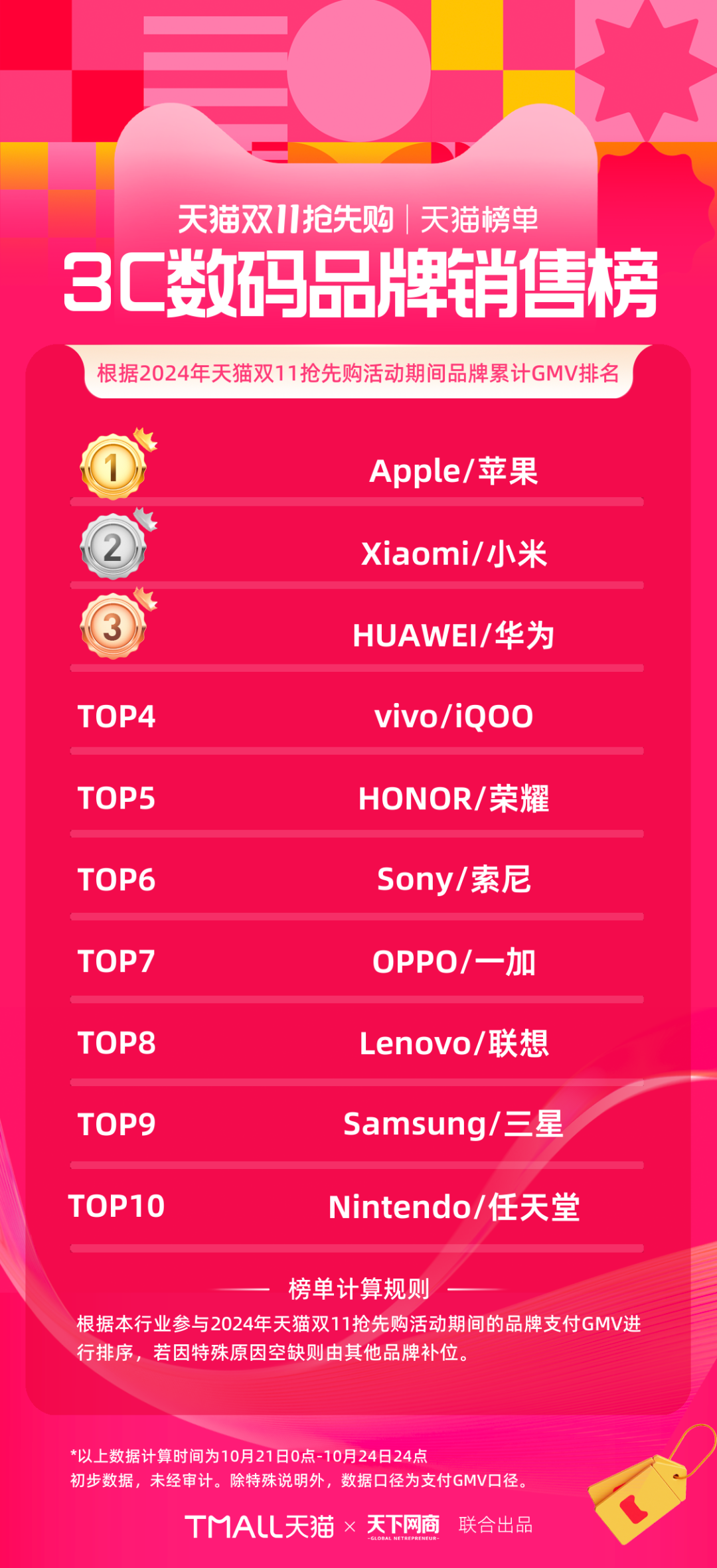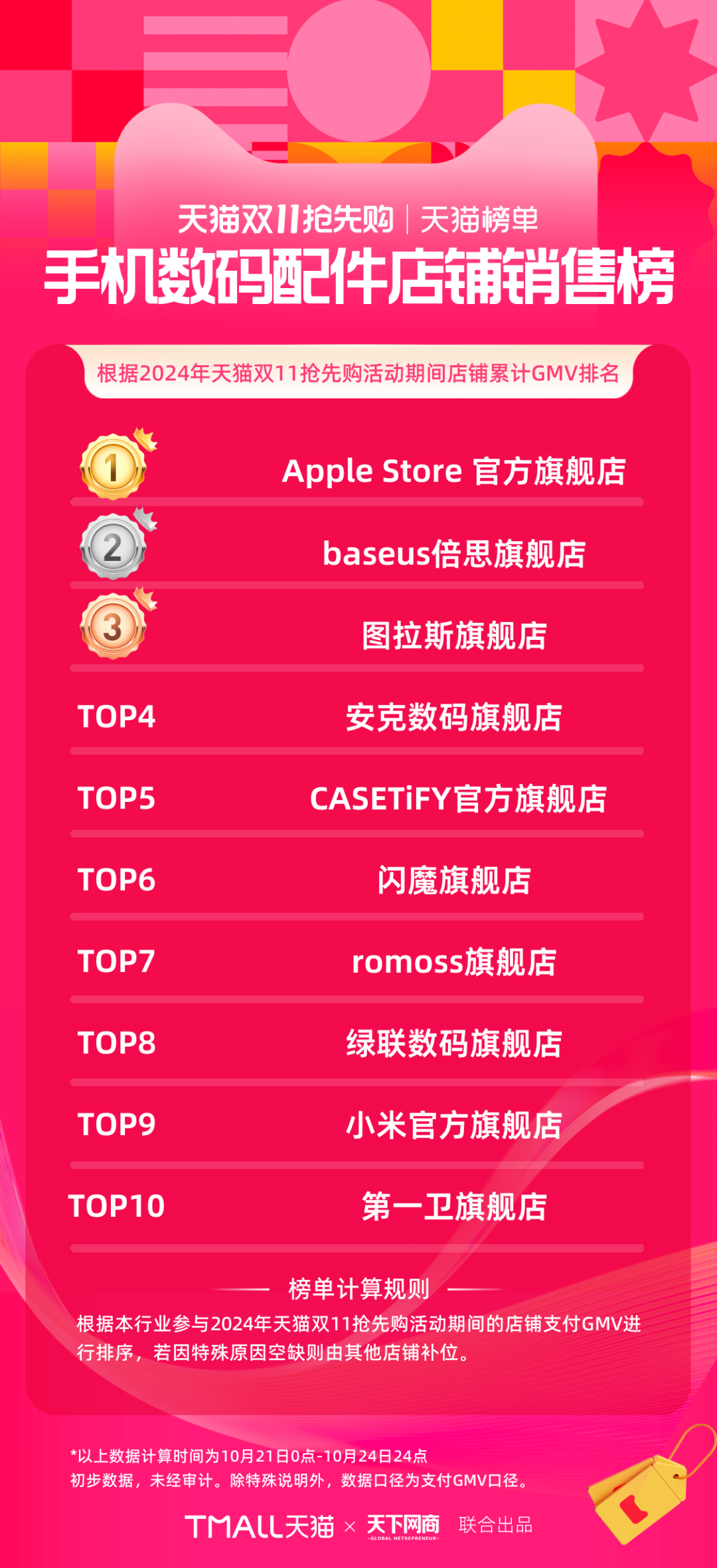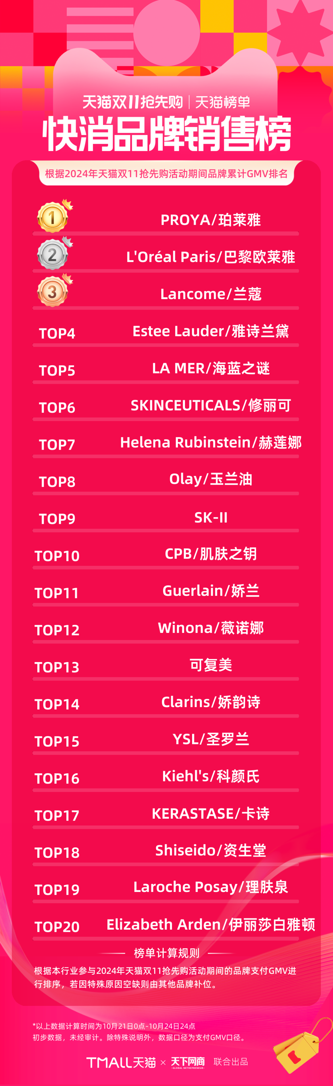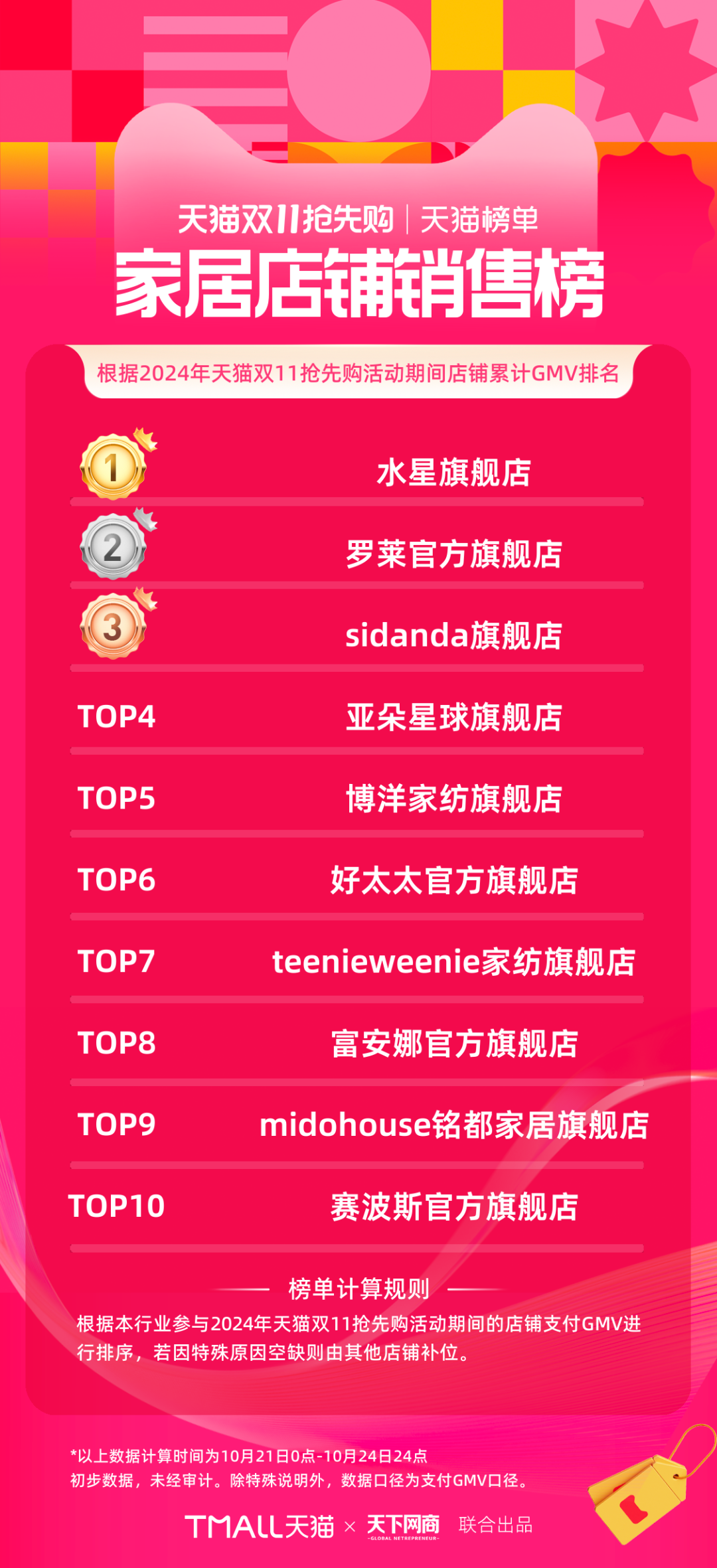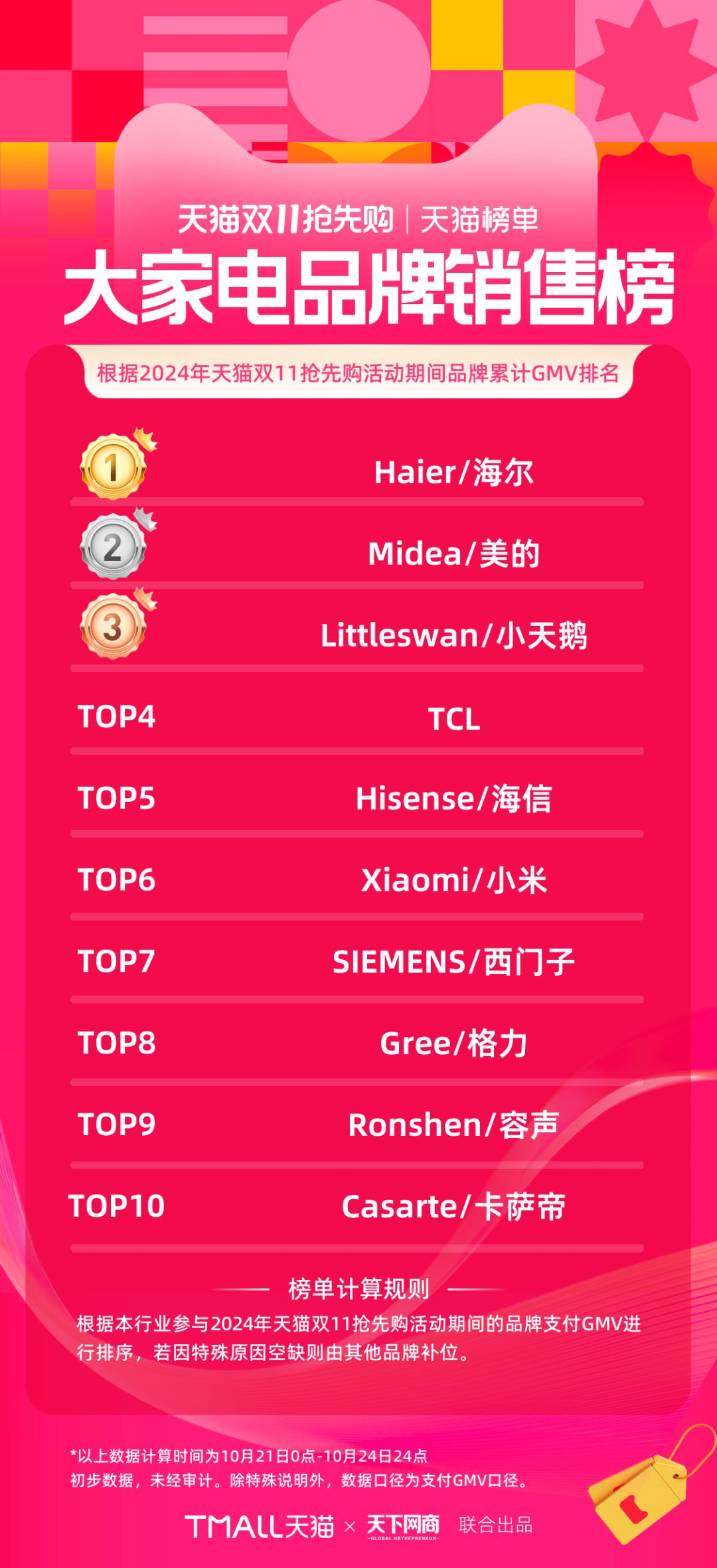 以下為《天下網(wǎng)商》聯(lián)合天貓發(fā)布的2024年天貓雙11第一階段(10月21日-10月24日)品牌成交排行榜,祝賀商家們。
