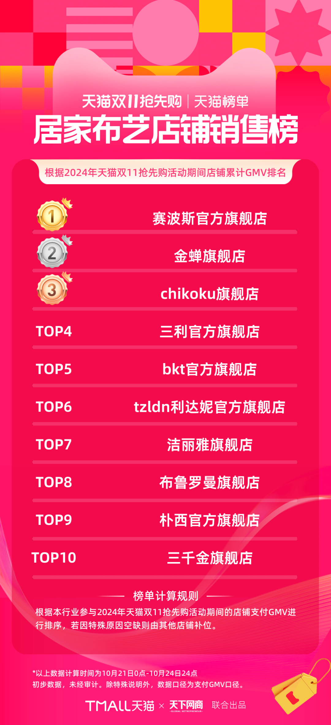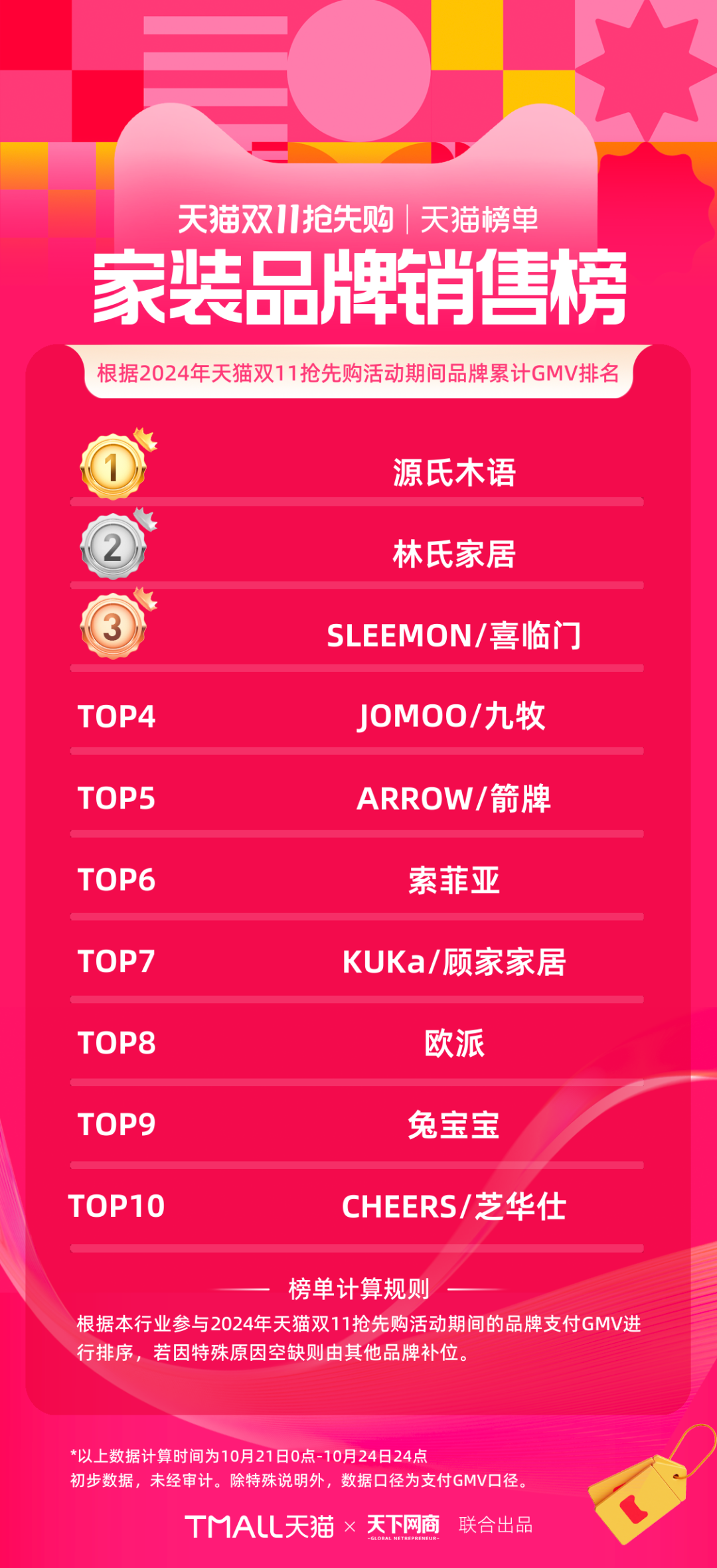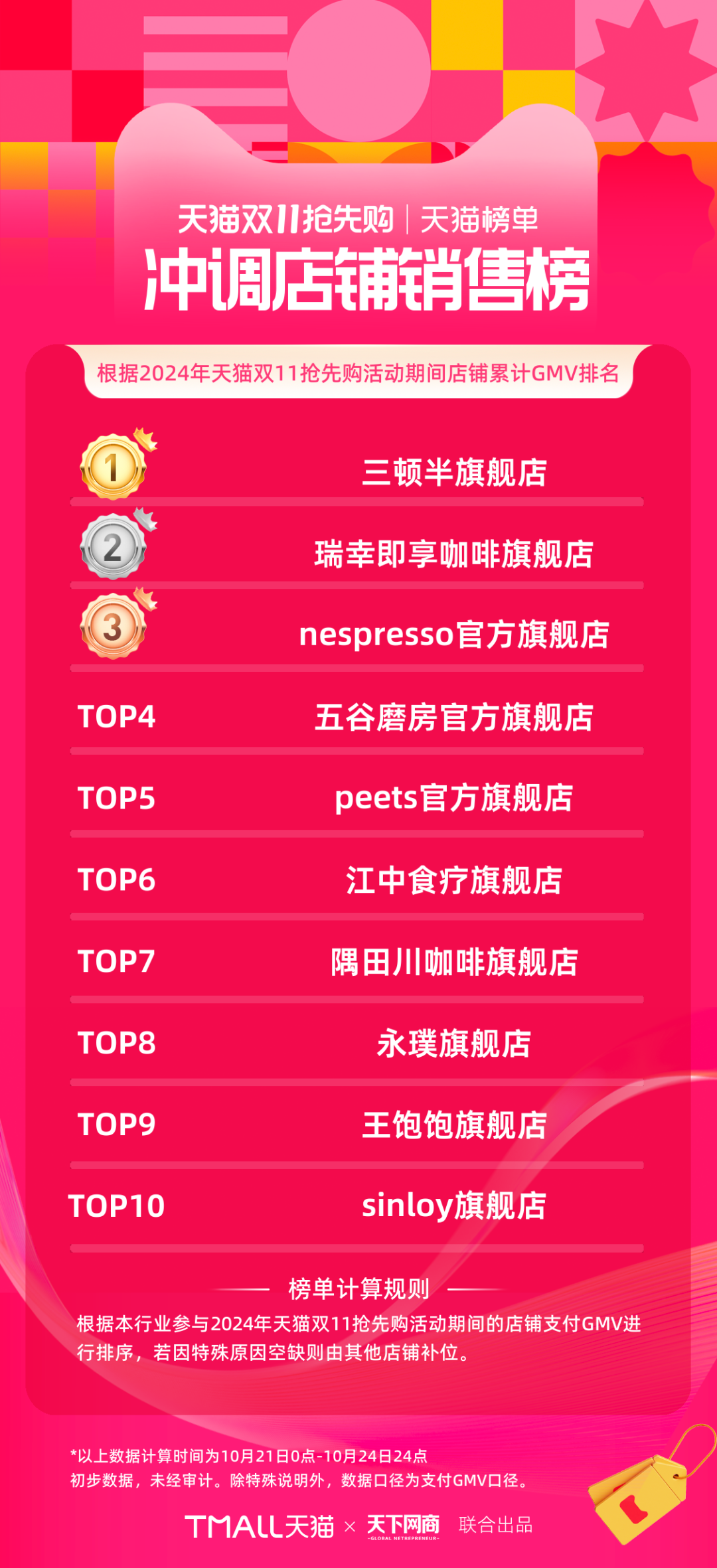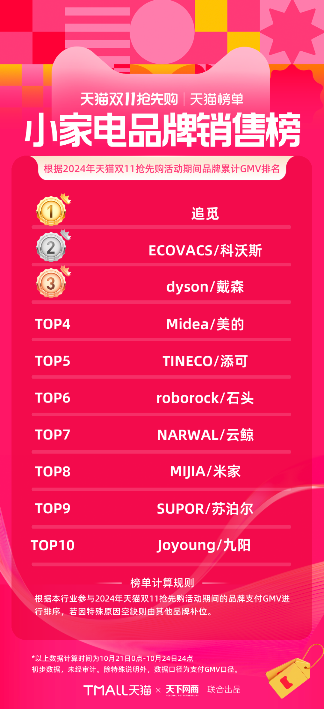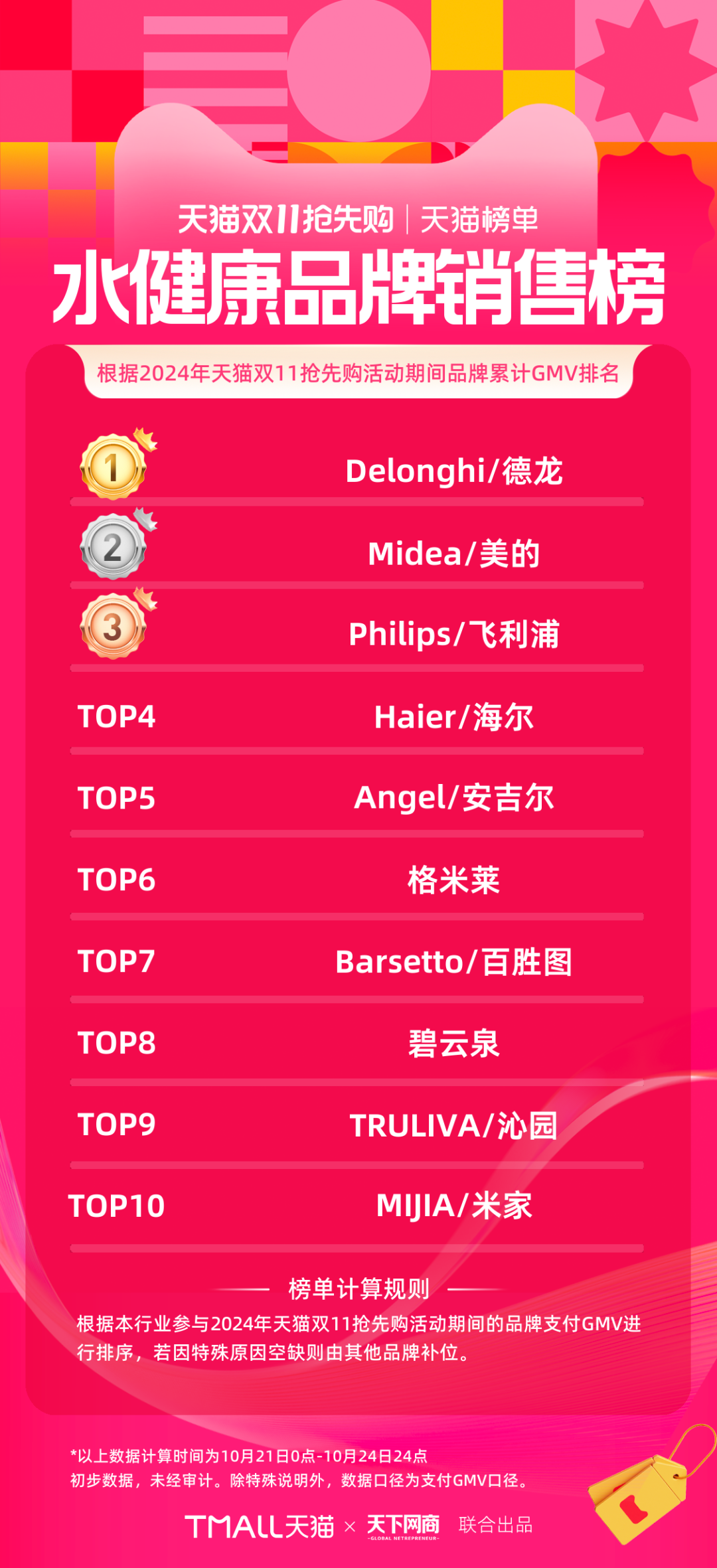 以下為《天下網(wǎng)商》聯(lián)合天貓發(fā)布的2024年天貓雙11第一階段(10月21日-10月24日)品牌成交排行榜,祝賀商家們。