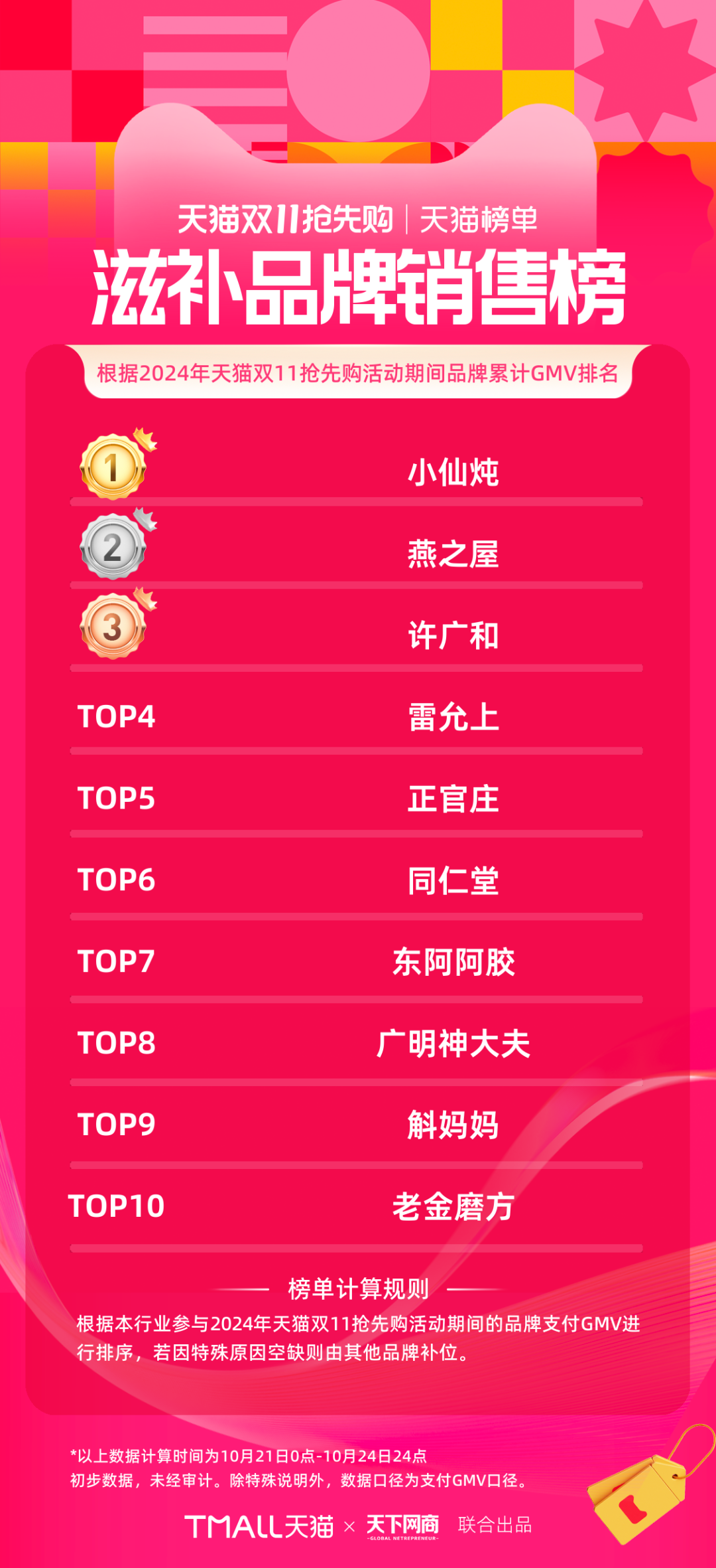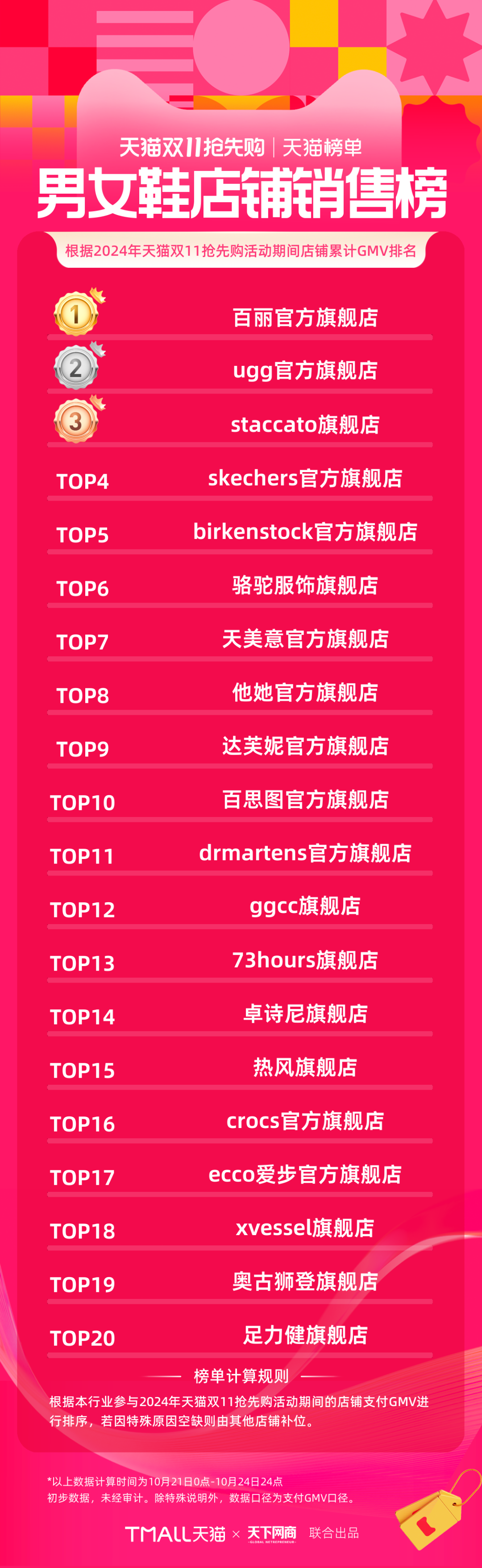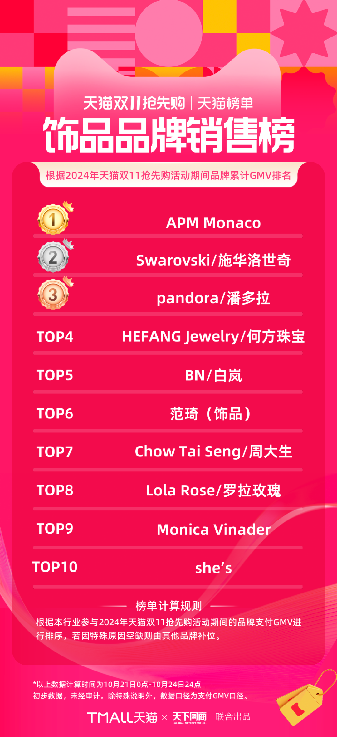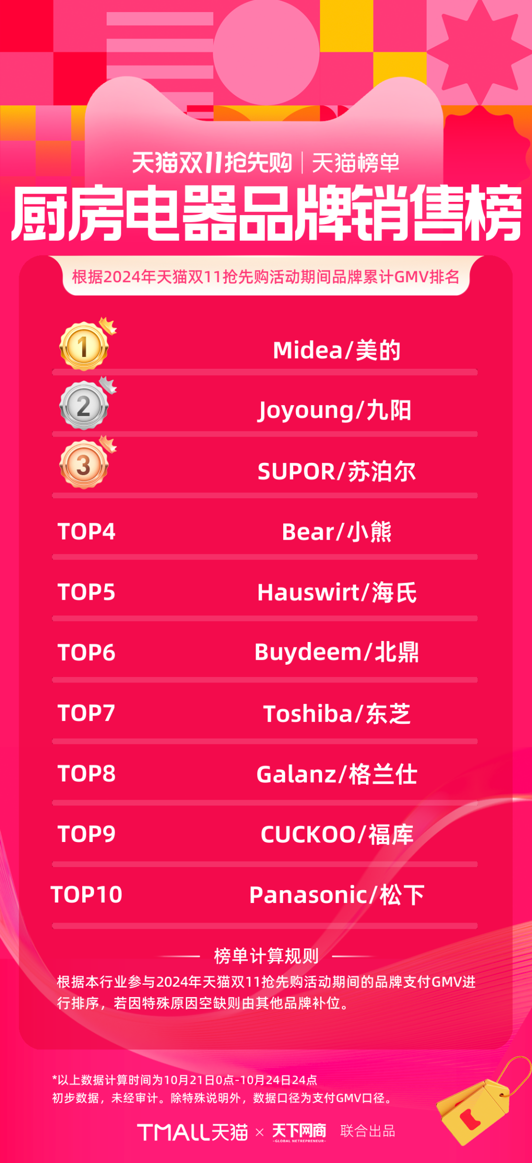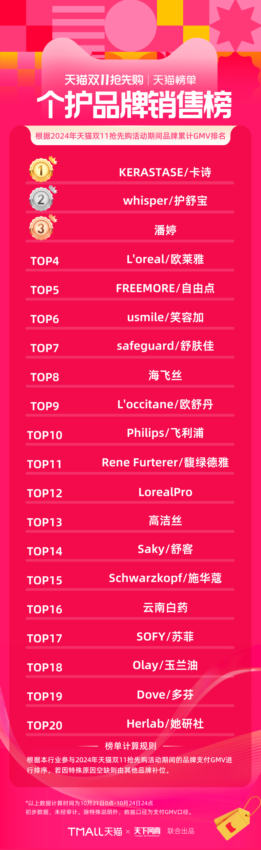 以下為《天下網(wǎng)商》聯(lián)合天貓發(fā)布的2024年天貓雙11第一階段(10月21日-10月24日)品牌成交排行榜,祝賀商家們。