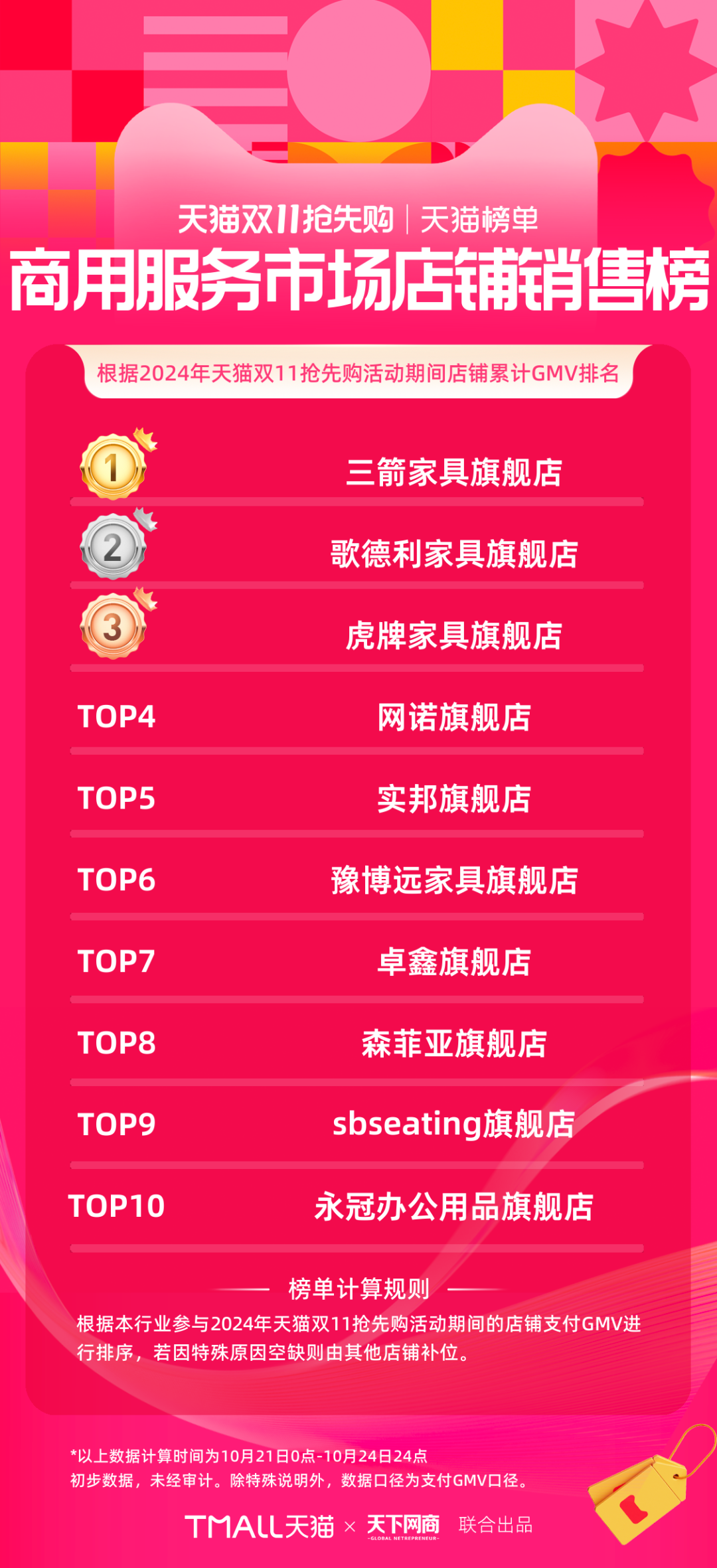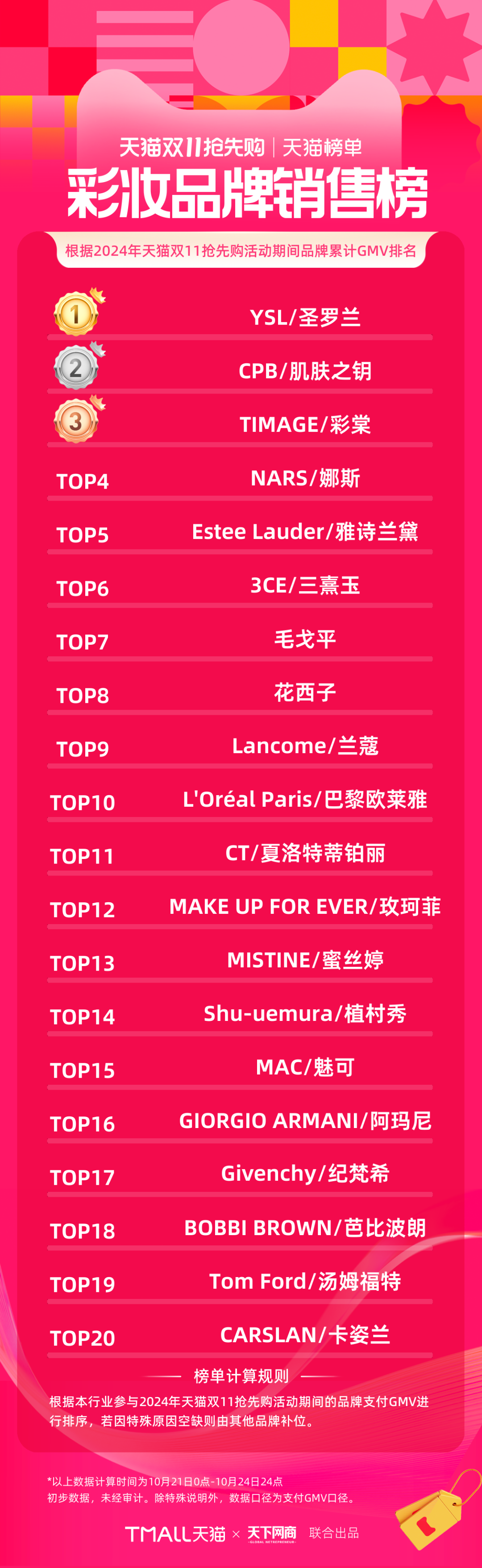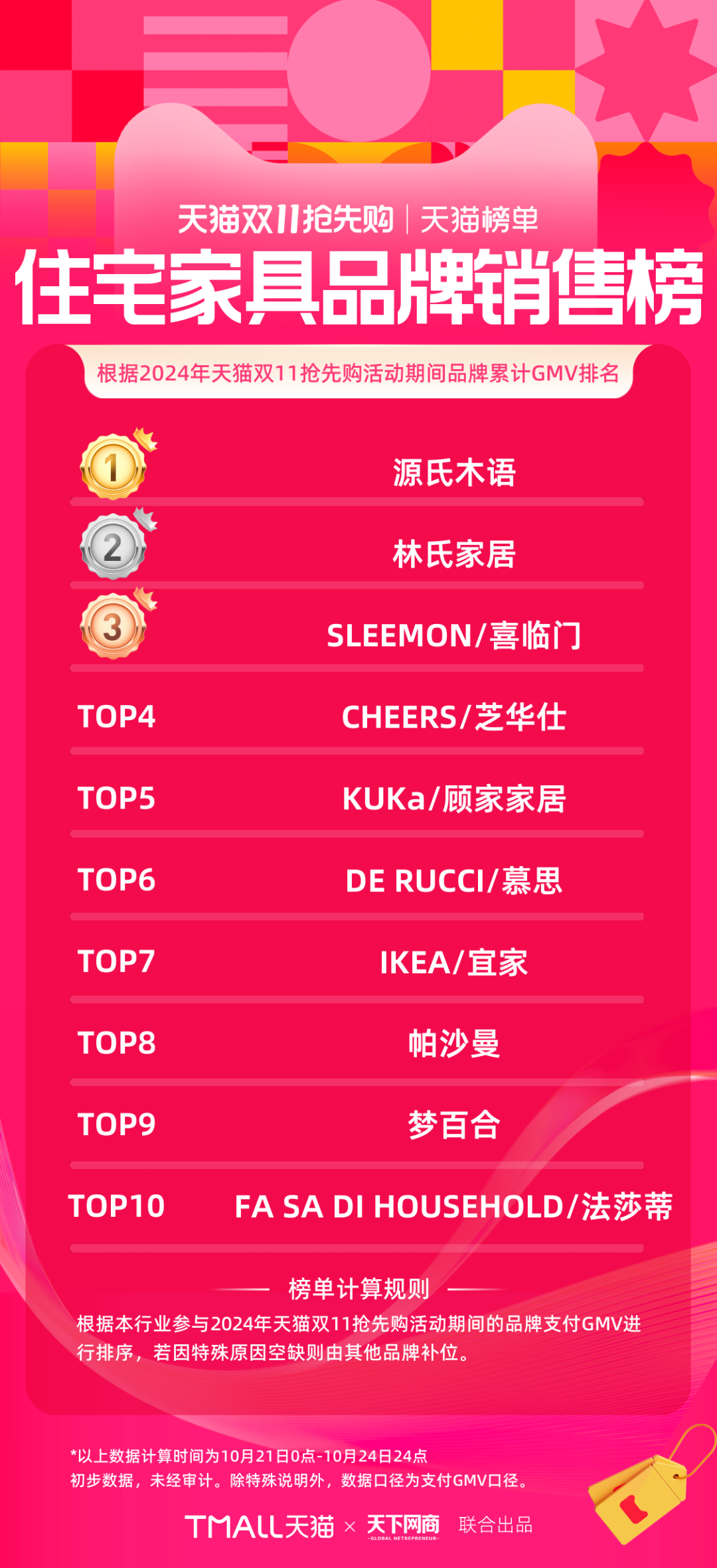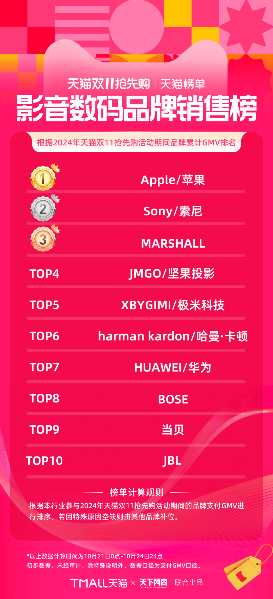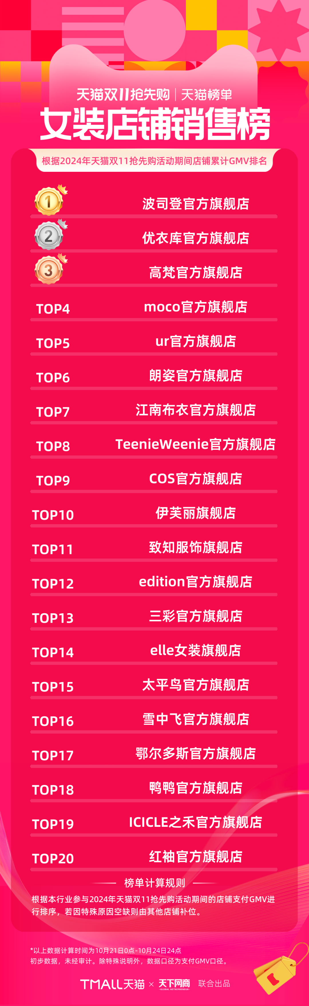 以下為《天下網(wǎng)商》聯(lián)合天貓發(fā)布的2024年天貓雙11第一階段(10月21日-10月24日)品牌成交排行榜,祝賀商家們。