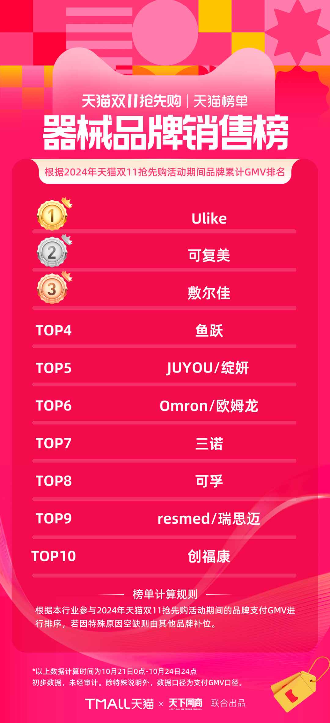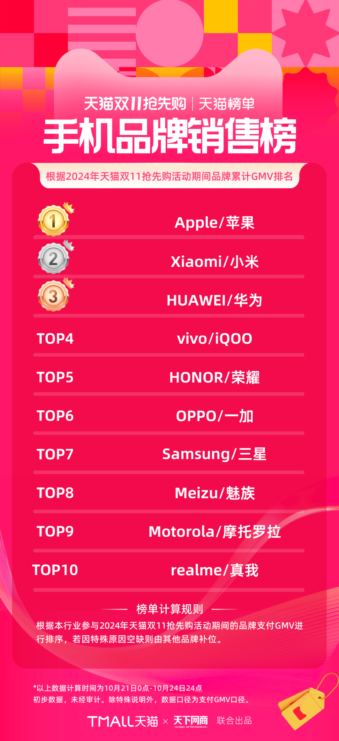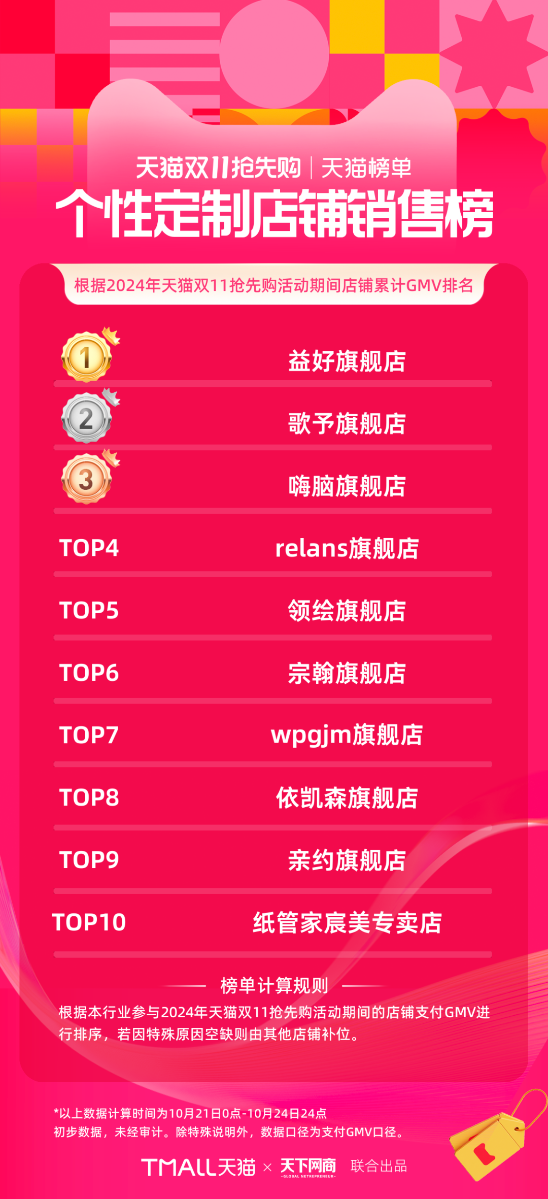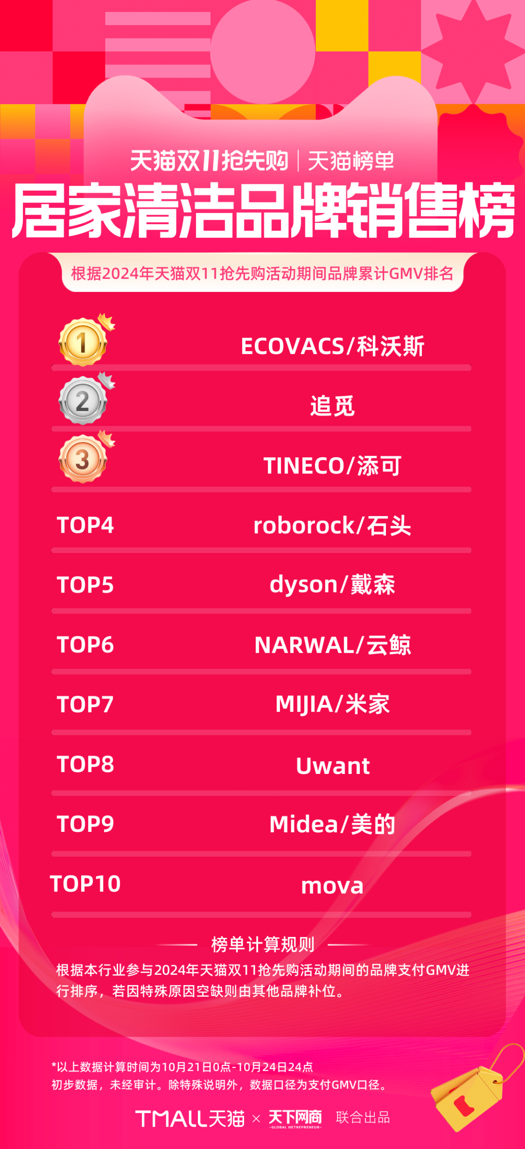 以下為《天下網(wǎng)商》聯(lián)合天貓發(fā)布的2024年天貓雙11第一階段(10月21日-10月24日)品牌成交排行榜,祝賀商家們。