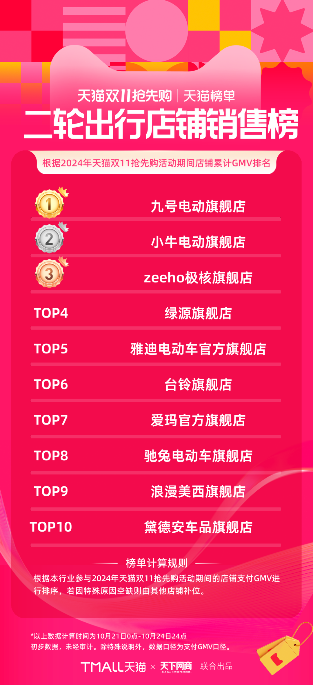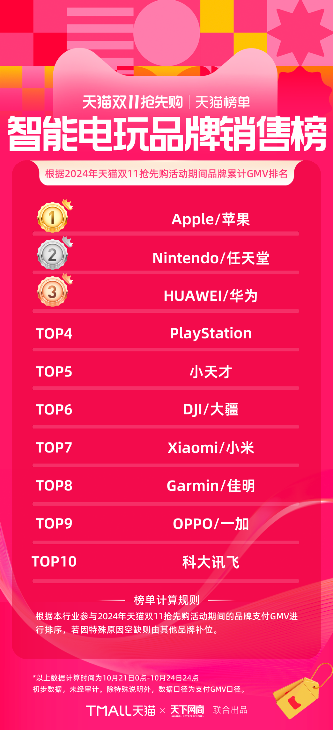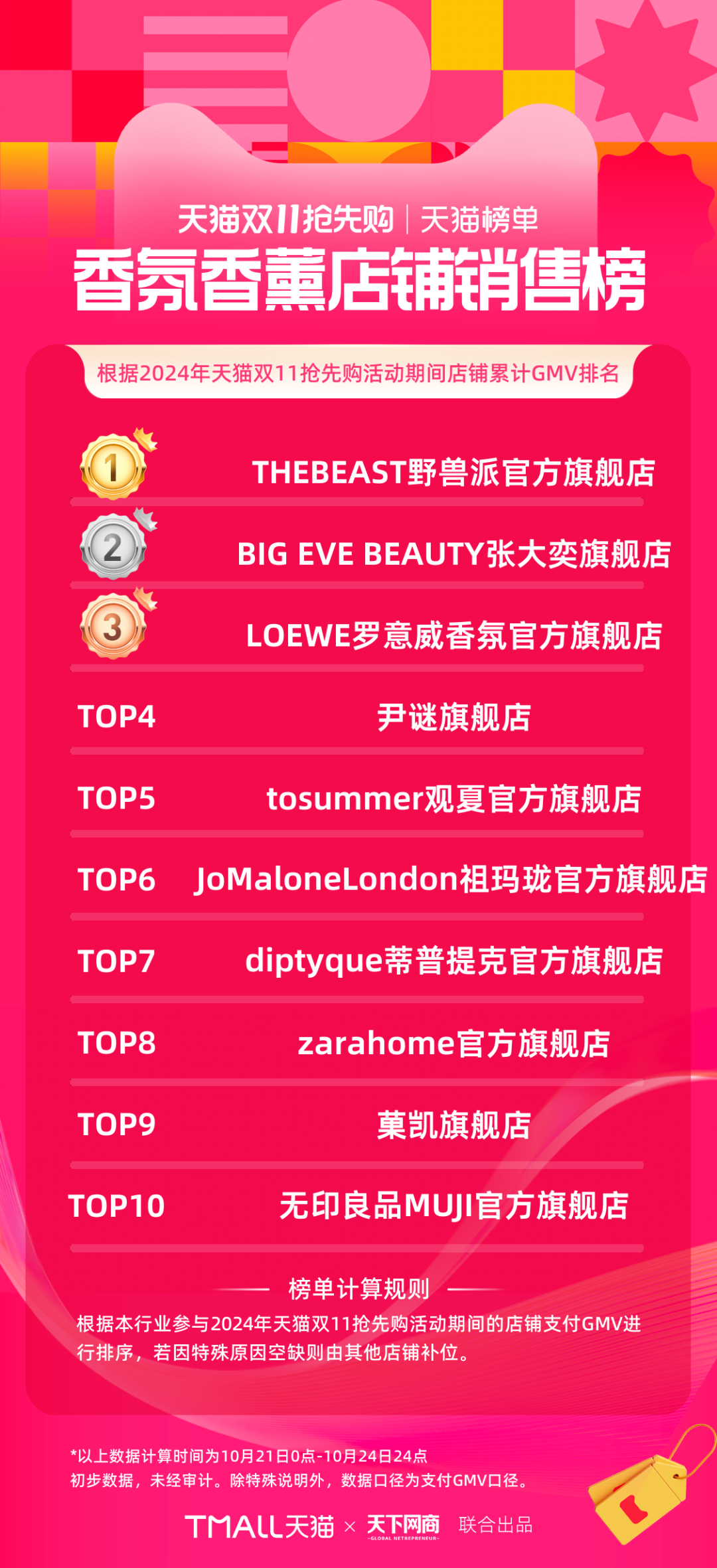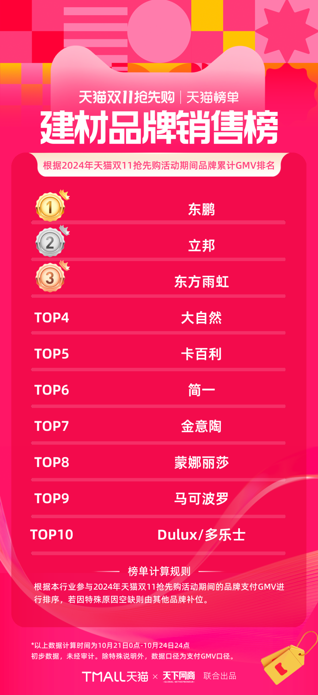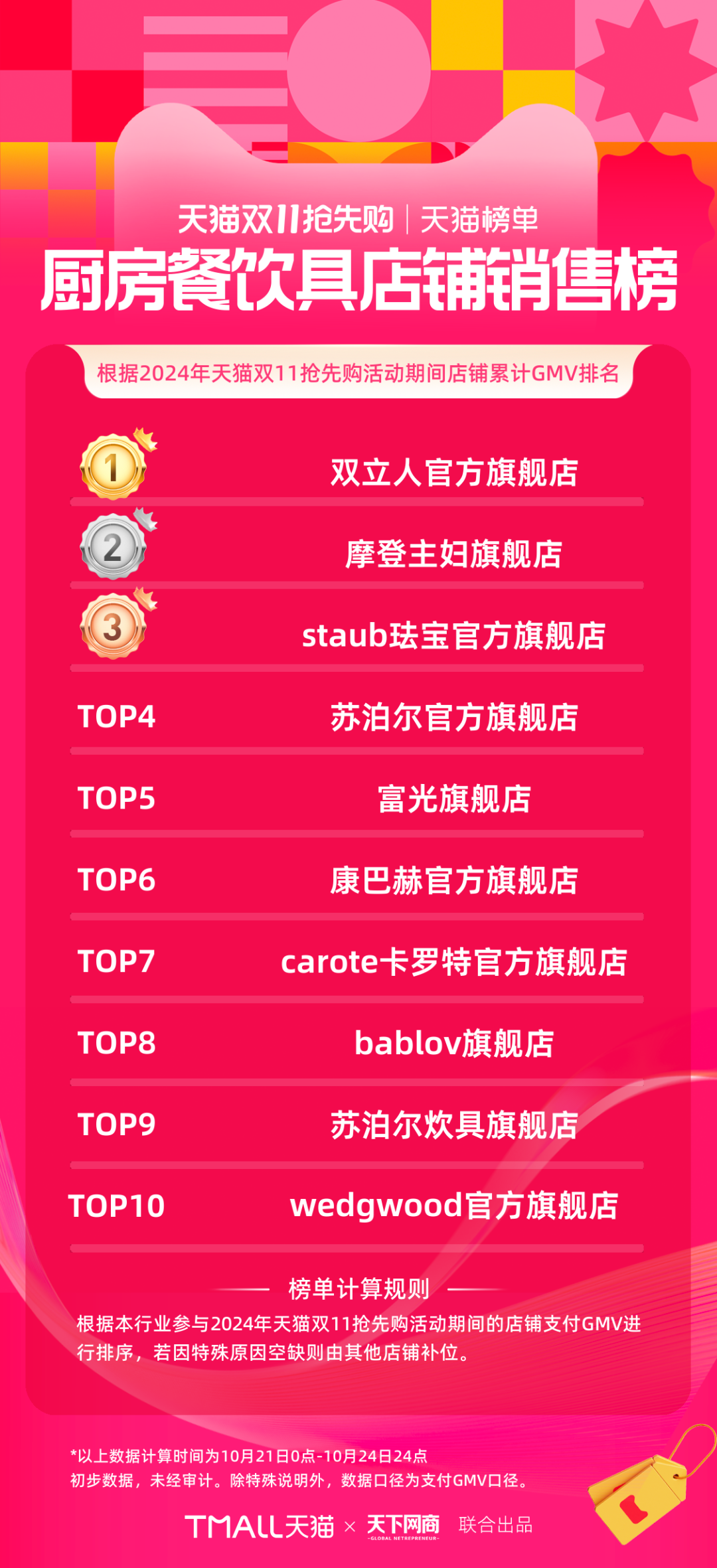 以下為《天下網(wǎng)商》聯(lián)合天貓發(fā)布的2024年天貓雙11第一階段(10月21日-10月24日)品牌成交排行榜,祝賀商家們。