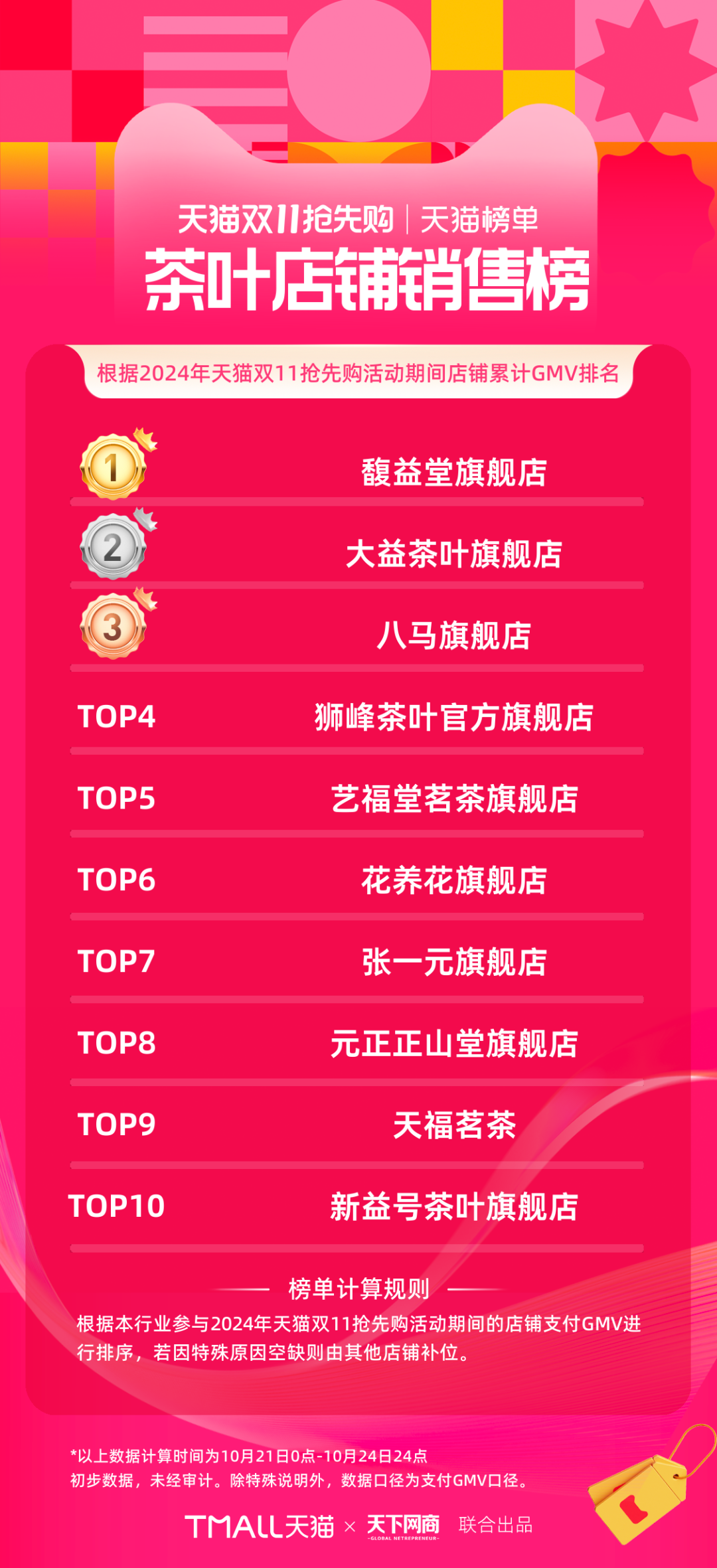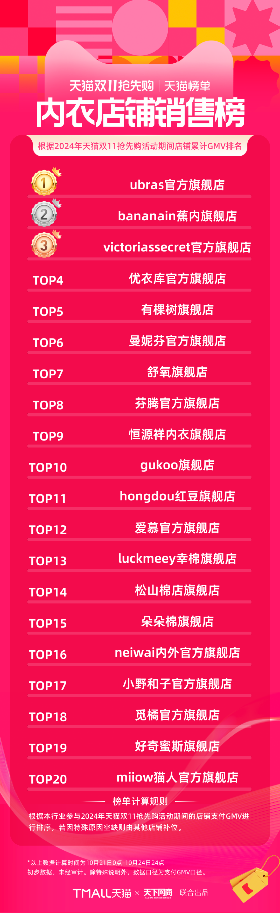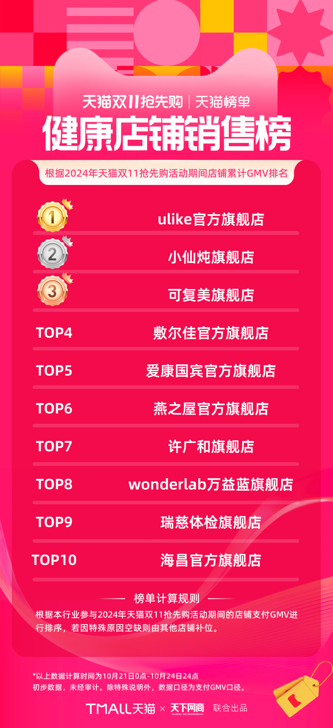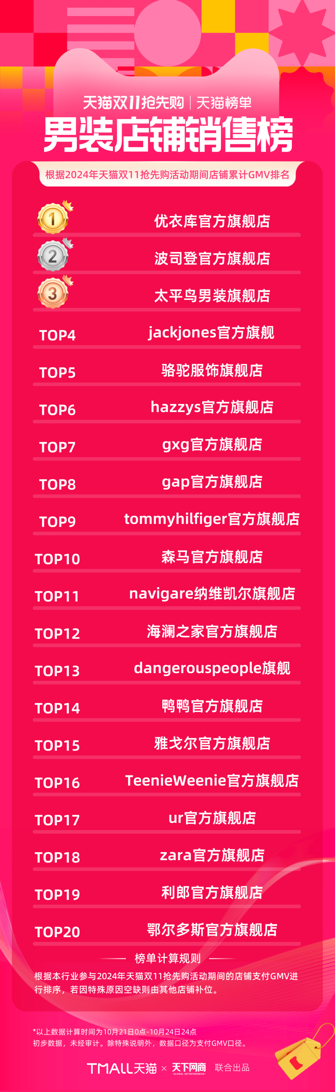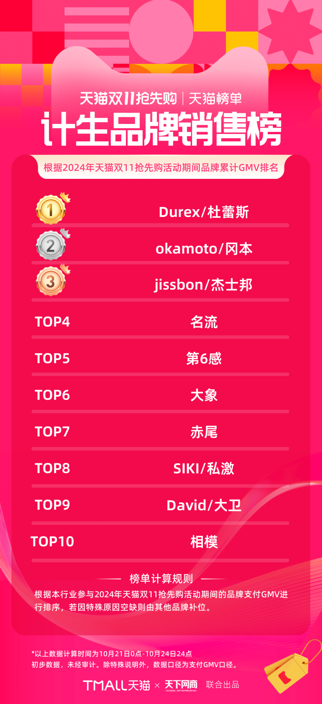 以下為《天下網(wǎng)商》聯(lián)合天貓發(fā)布的2024年天貓雙11第一階段(10月21日-10月24日)品牌成交排行榜,祝賀商家們。