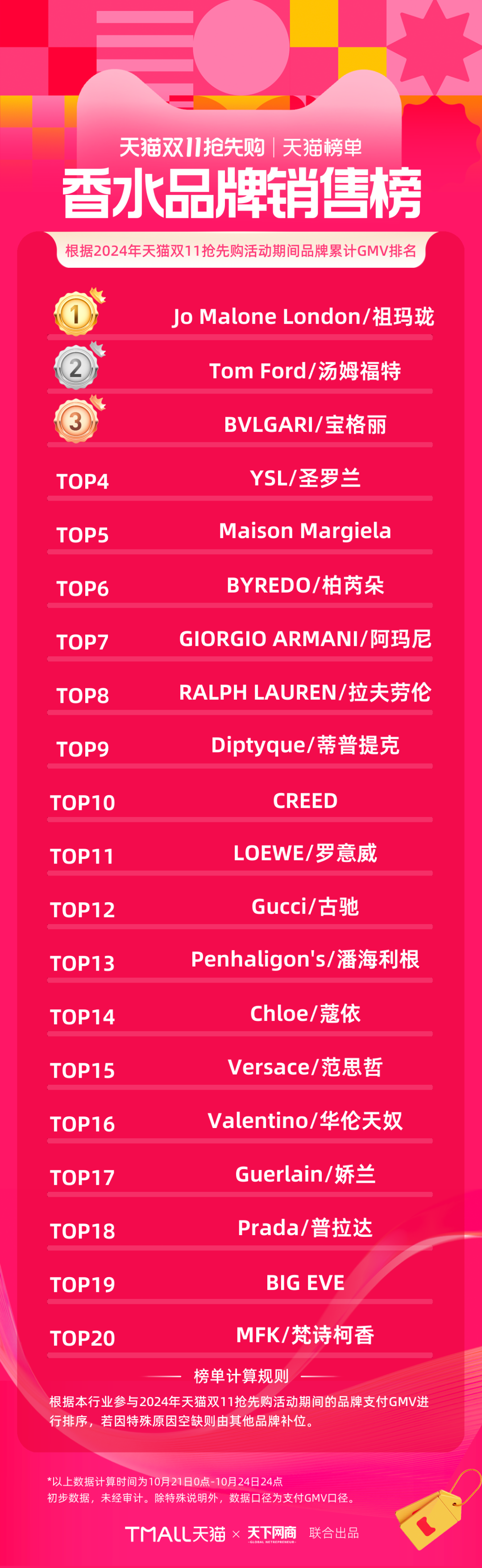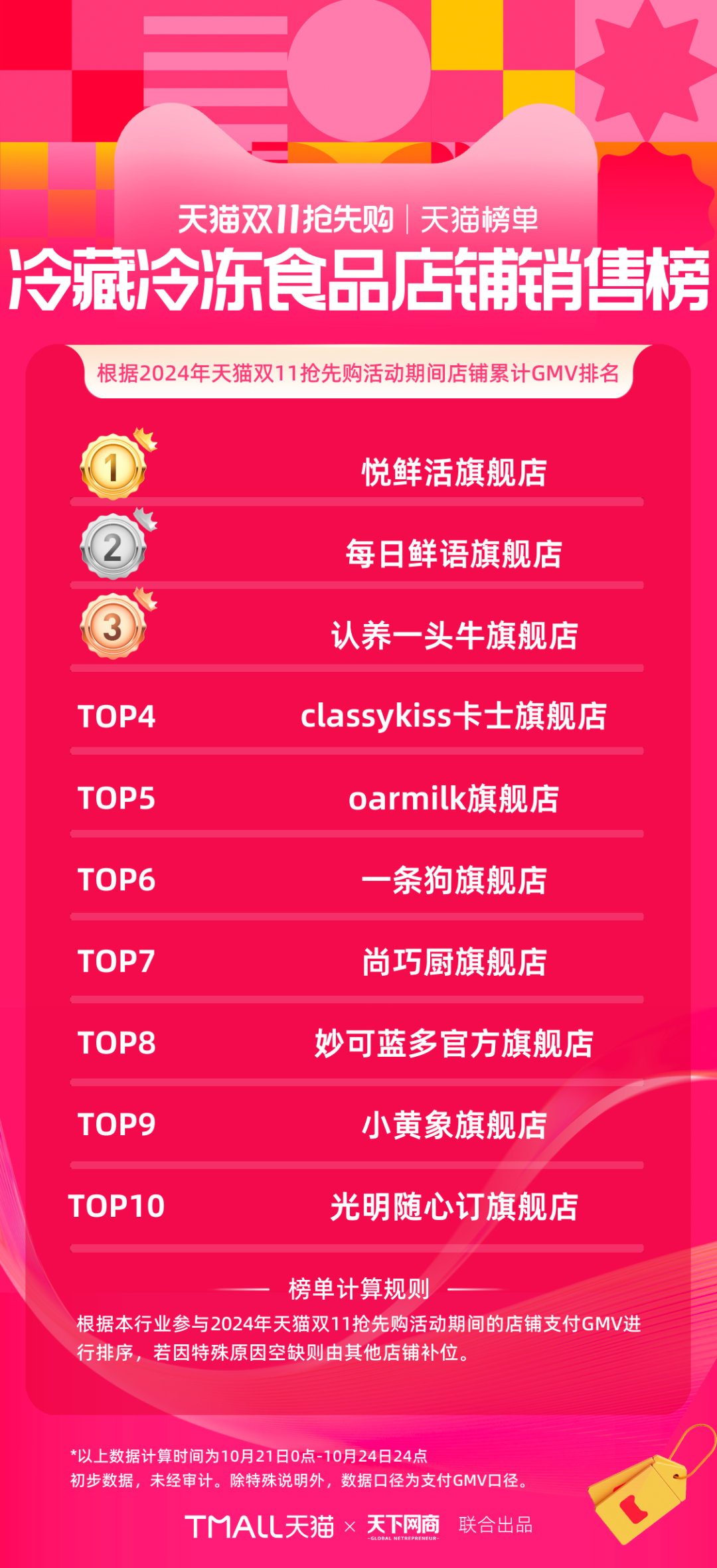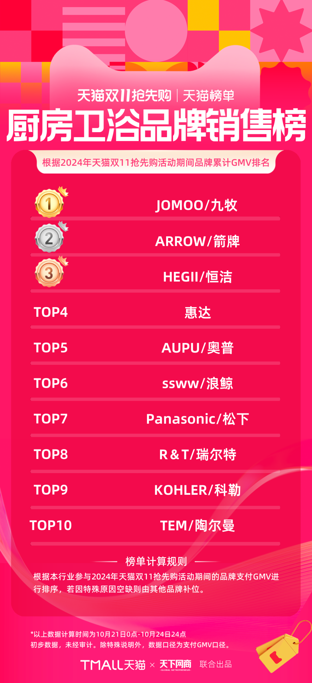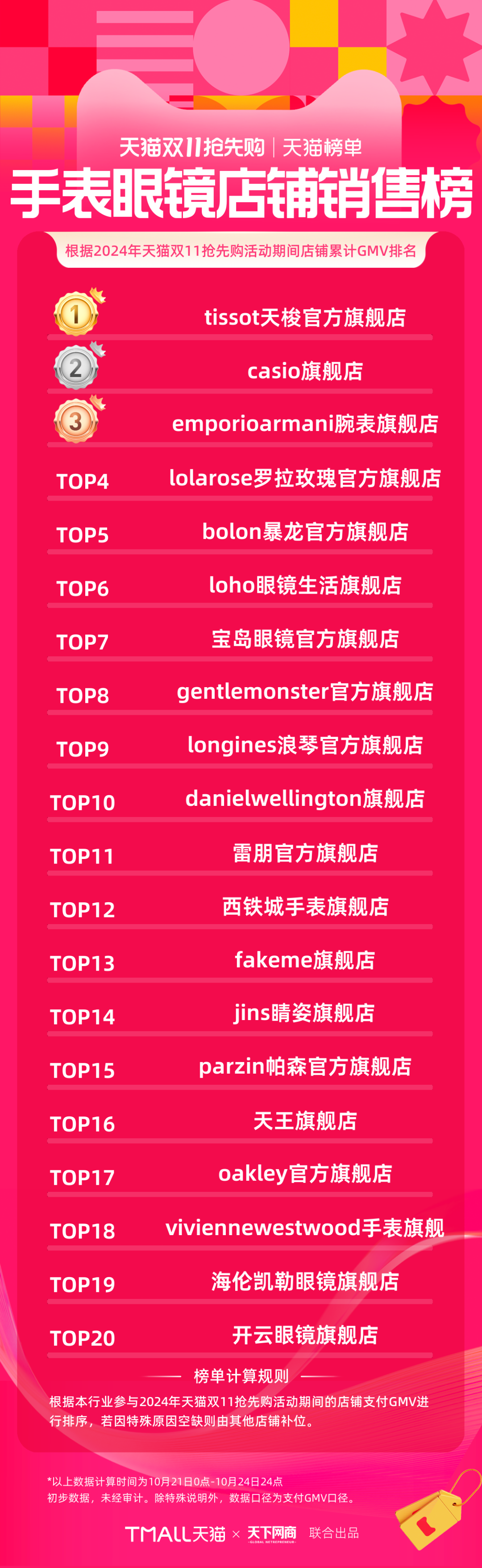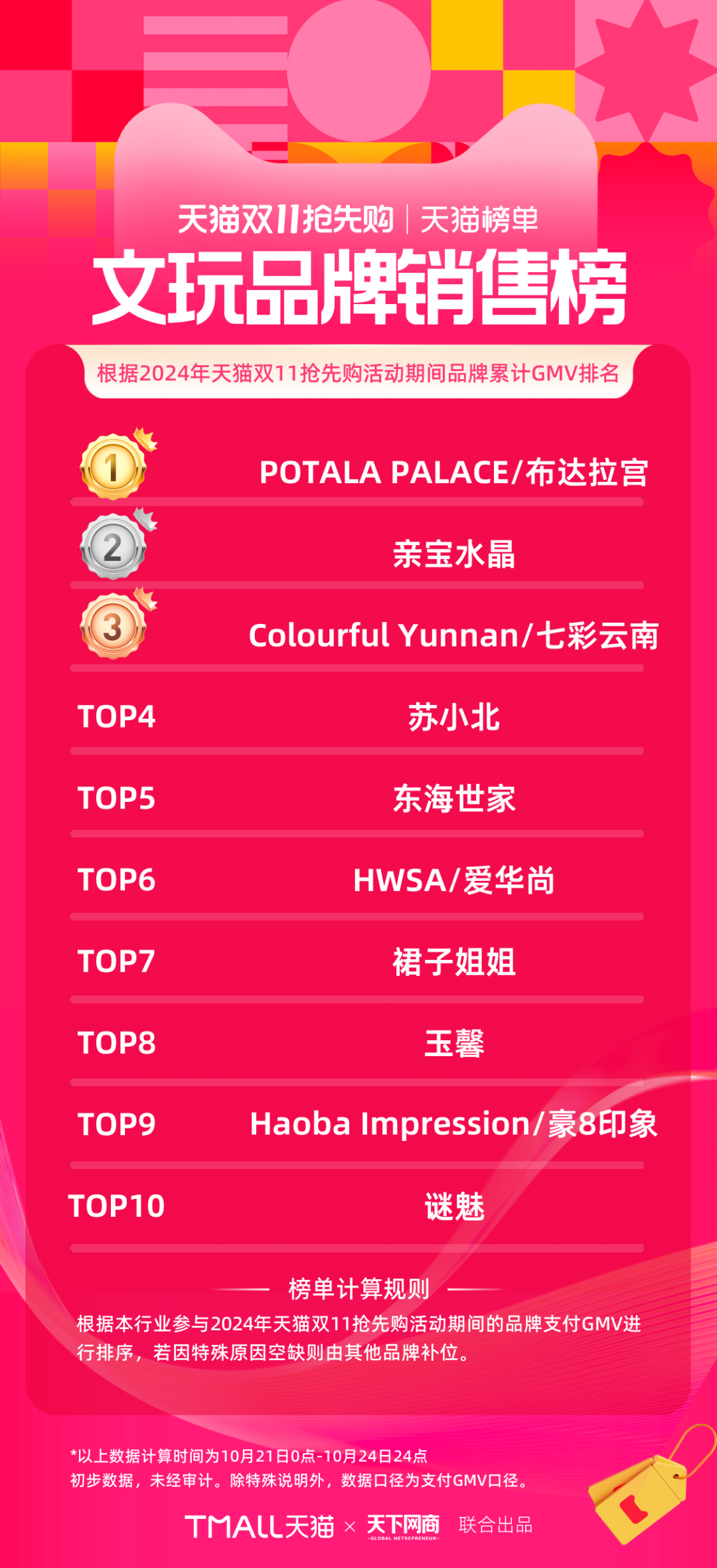 以下為《天下網(wǎng)商》聯(lián)合天貓發(fā)布的2024年天貓雙11第一階段(10月21日-10月24日)品牌成交排行榜,祝賀商家們。