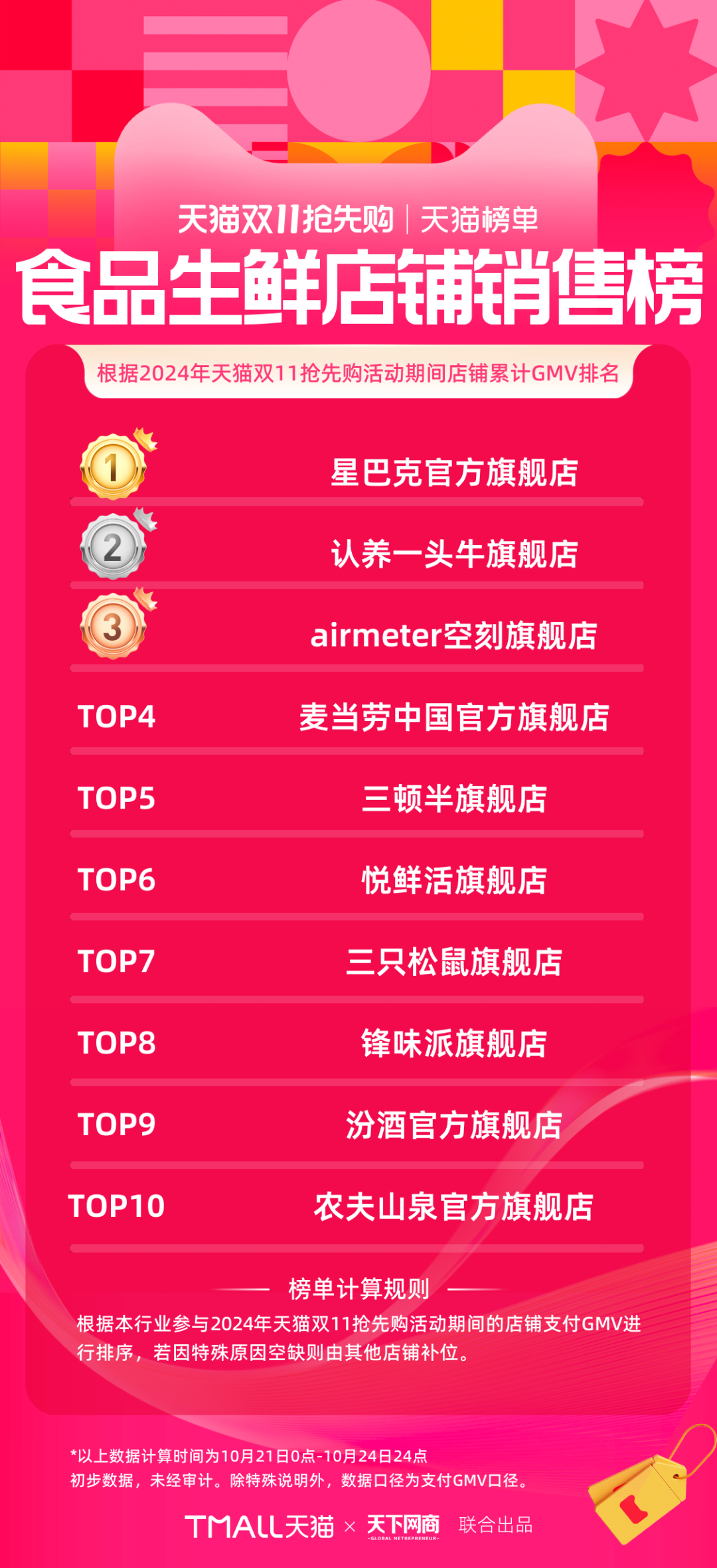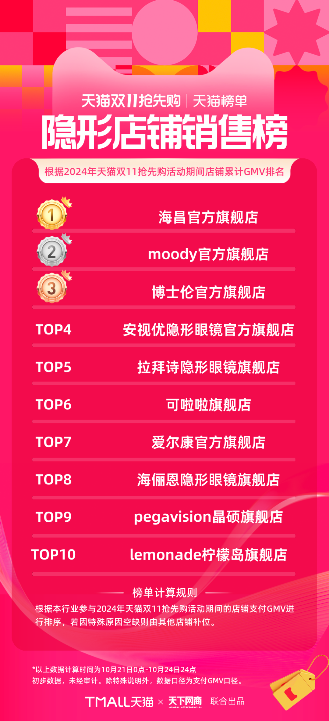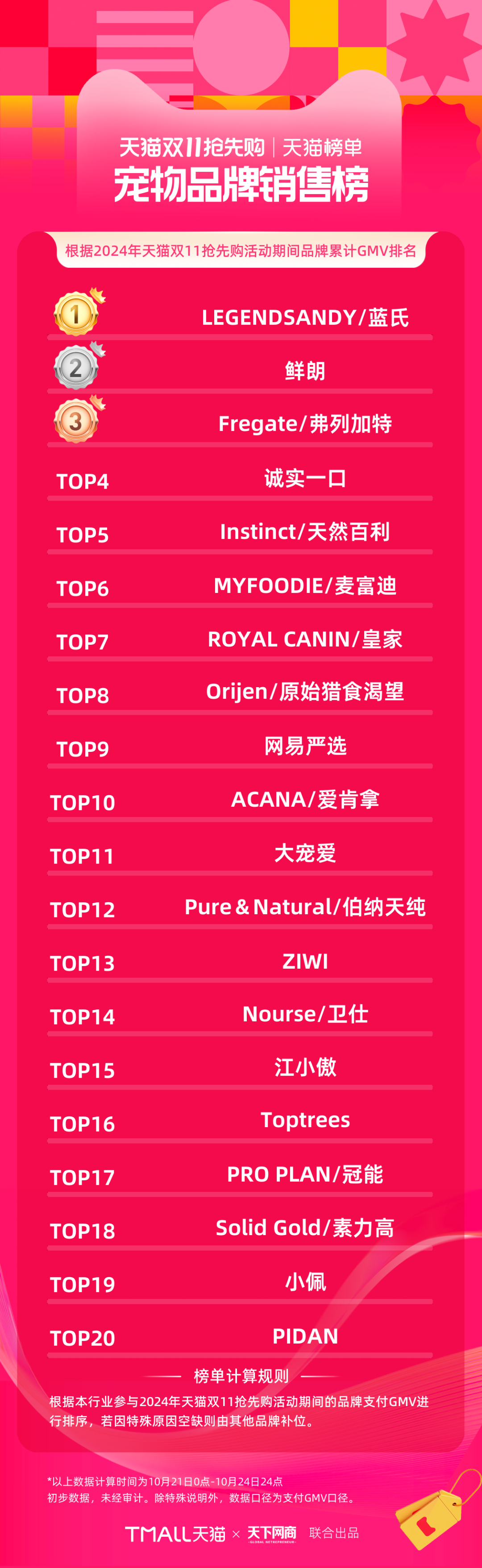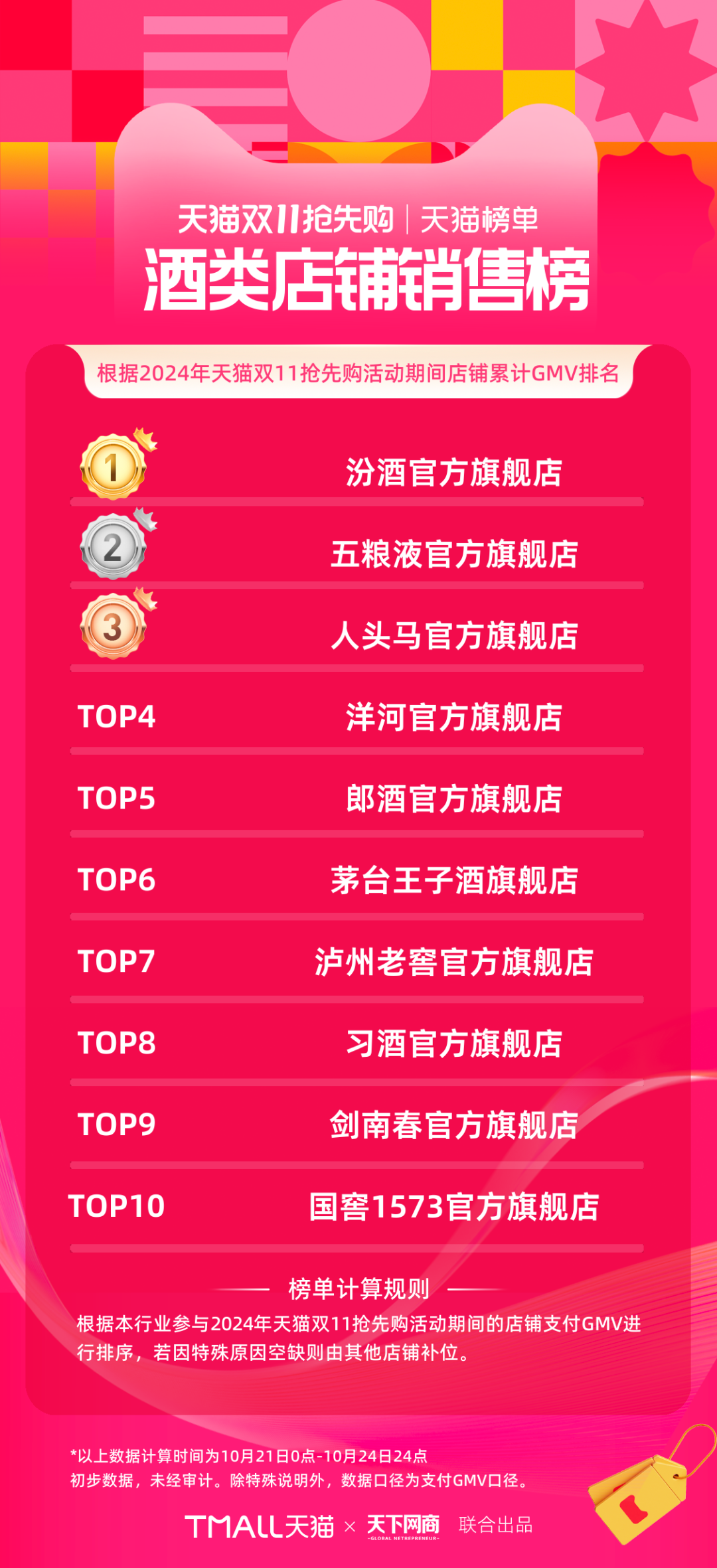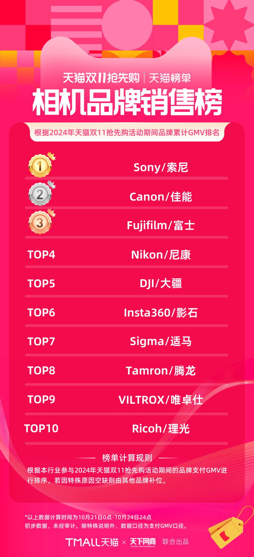 以下為《天下網(wǎng)商》聯(lián)合天貓發(fā)布的2024年天貓雙11第一階段(10月21日-10月24日)品牌成交排行榜,祝賀商家們。