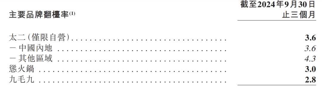 從2024年年中報(bào)來看,截止到6月30日,太二的翻臺(tái)率為3.8,到第三季度則為3.6,輕微下滑;