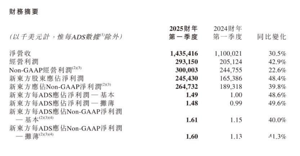 財報顯示,新東方2025財年第一季度的經(jīng)營利潤同比上升42.9%至2.93億美元。但是去除了東方甄選自營產(chǎn)品及直播電商業(yè)務的經(jīng)營虧損后,新東方該財季經(jīng)營利潤同比上升58.4%至3.03億美元。