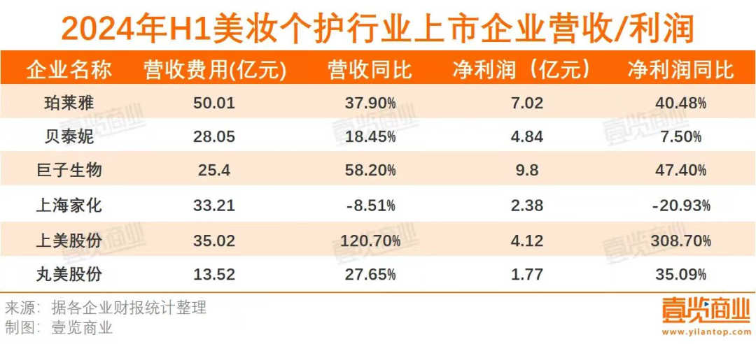 據(jù)壹覽商業(yè)此前統(tǒng)計,除了上海家化以外,已上市的美妝個護企業(yè),幾乎都在今年上半年保持了營收、凈利潤同比正增長。其中,上美集團實現(xiàn)了營收、凈利潤同比三位數(shù)增長,珀萊雅、巨子生物、丸美股份都實現(xiàn)了營收、凈利潤同比二位數(shù)的增長。