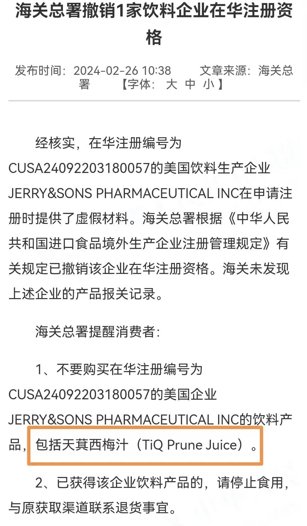 1月18日,王海指出東方甄選帶貨的“TiQ天萁西梅汁”含有瀉藥成分,與宣傳不符。海關(guān)總署隨后提醒消費(fèi)者暫停飲用并退貨。東方甄選回應(yīng)稱,該產(chǎn)品為外鏈合作商家產(chǎn)品,已啟動調(diào)查程序,并停止售賣。