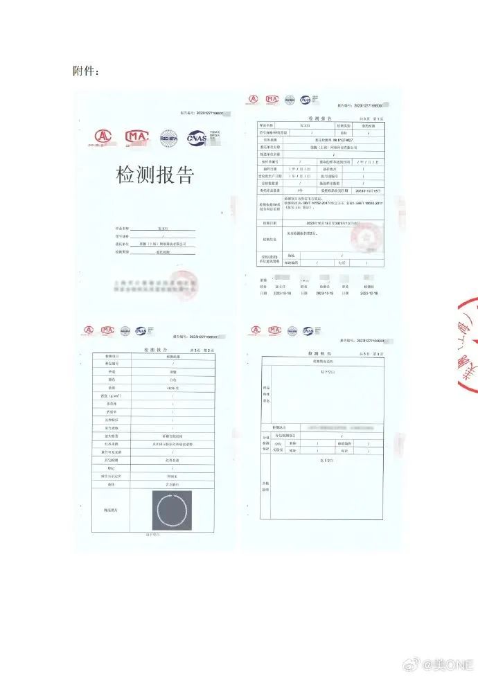 聲明及部分附件報告 圖源:美ONE微博