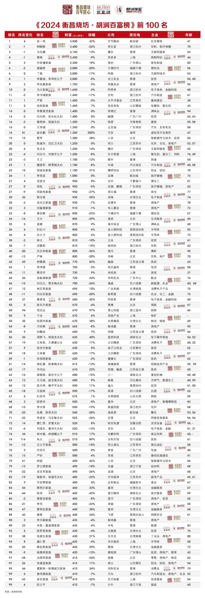 2024胡潤百富榜發(fā)布,張一鳴3500億成中國首富