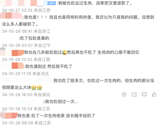 除了前述提到的這兩起案例,在某媒體報(bào)道此次“網(wǎng)曝塔斯汀漢堡吃出生肉”事件的微博評(píng)論區(qū),不少網(wǎng)友表示自己也曾在塔斯汀吃到過(guò)生的食物。有網(wǎng)友留言稱,“我也是!而且也是同樣的雞肉堡,我還以為只是我的問(wèn)題,沒(méi)想到這么多人都碰到了”。