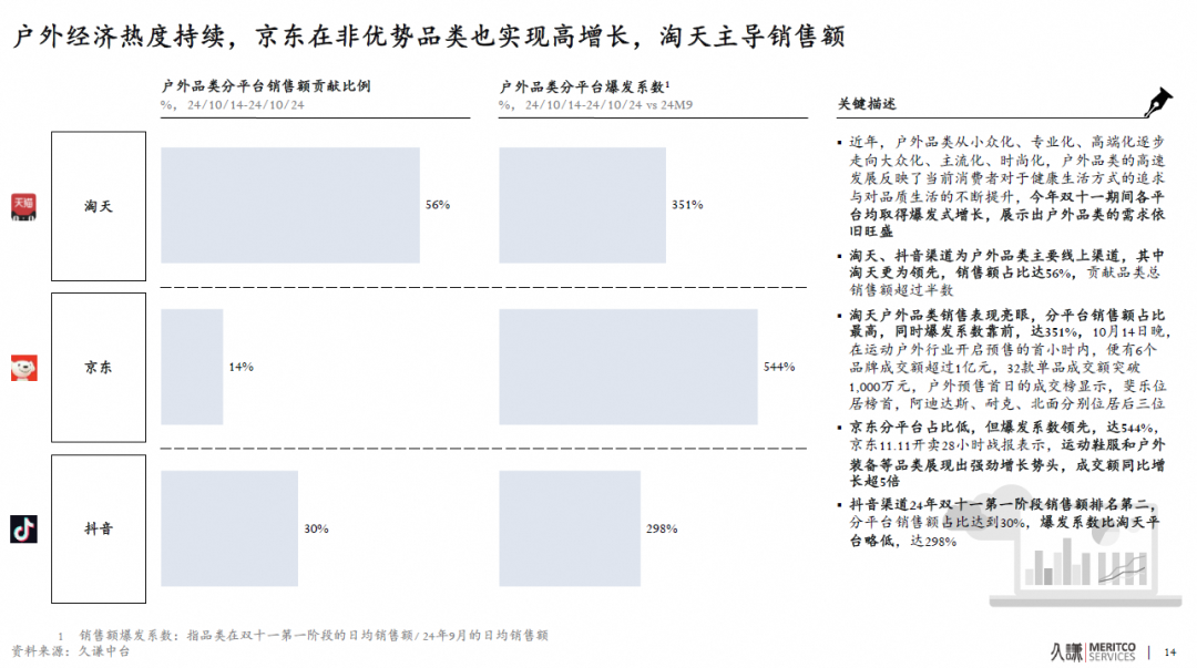 隨著電商滲透率的提升,線上渠道成為運動戶外品牌的主要銷售渠道,其中淘天更是以56.5%的銷售額占比,貢獻了超過半數(shù)的品類總銷售額。淘天戶外品類的銷售表現(xiàn)尤為亮眼,不僅分平臺銷售額占比最高,爆發(fā)系數(shù)也達到了驚人的351%。