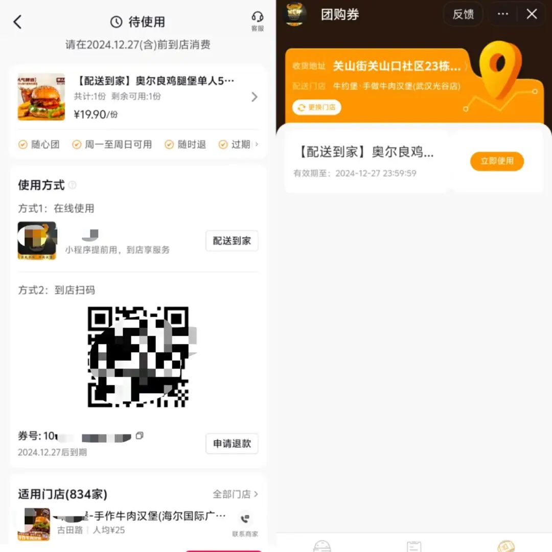 以開通隨心團的漢堡商品為例,用戶購買團購套餐后,可以到店進行核銷取餐,也可以選擇直接配送,60天內(nèi)均可隨時預約配送。但與以往可直接在訂單頁填寫地址、并預約配送時間的團購配送方式不同,隨心團商品的配送服務,需要在訂單頁中,點擊跳轉(zhuǎn)至商家小程序內(nèi)完成最終的配送下單。