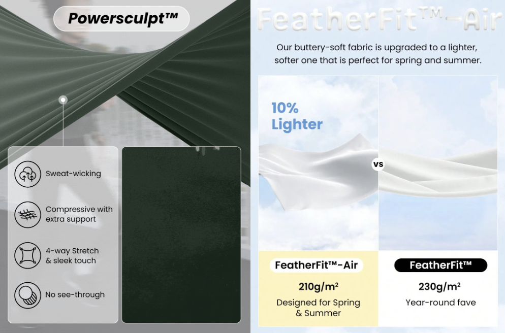 而且修飾身材的效果也師出有名,目前Glowmode開發(fā)了Powersculpt™、FeatherFit™兩種科技面料,并分別注冊了商標(biāo)。兩種面料都聲稱“四維拉伸”、不透光,快干面料Powersculpt主打吸濕排汗,超輕面料FeatherFit主打柔軟親膚。Glowmode還時(shí)不時(shí)給面料升升級,冬天加保溫功能,春夏出涼感減重版。