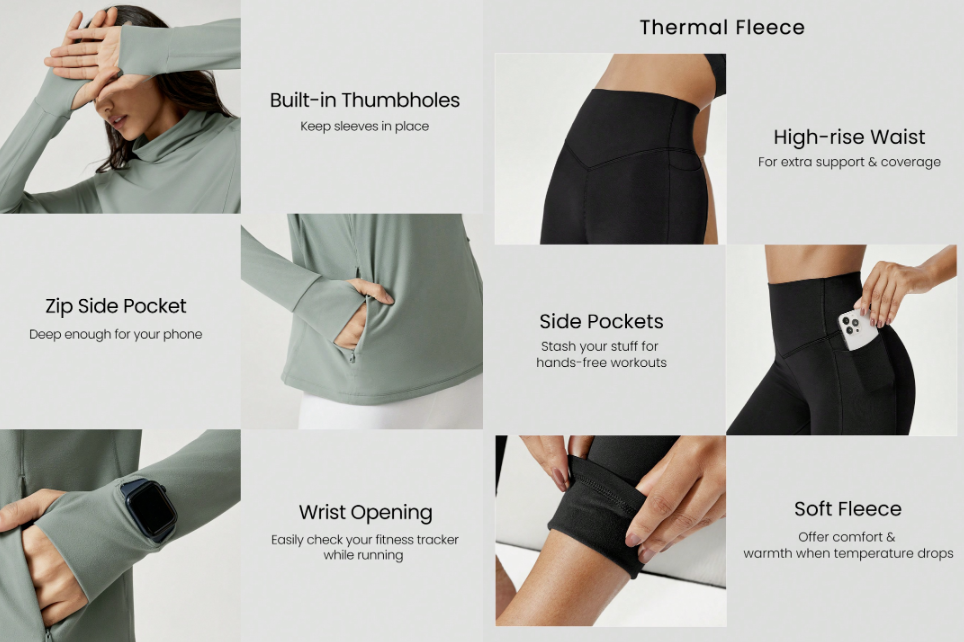 這種預(yù)埋爽點(diǎn)的小伎倆,Glowmode當(dāng)然也會一些。夾克口袋帶拉鏈,以防你跑步的時(shí)候兜里東西往外掉,袖子上挖拇指洞和表盤洞;瑜伽褲口袋能裝手機(jī),還一邊一個(gè),褲腰貼硅膠防滑條,做瑜伽動作隨便擰都不挪位。
