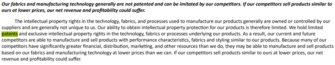 實(shí)際上,面料、技術(shù)、生產(chǎn)工藝等關(guān)鍵性的知識產(chǎn)權(quán),分散在合作供應(yīng)商手中。lululemon財(cái)報(bào)中寫道,如果供應(yīng)商用更低的價(jià)格銷售類似的產(chǎn)品,其營收和盈利就可能遭殃。