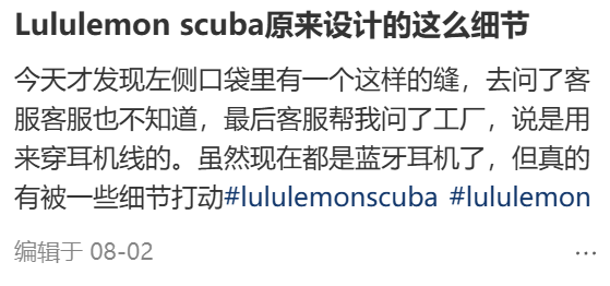 lululemon的拇指洞、隱形口袋等隱藏款福利就很得人心,拇指洞固定袖子讓衣服保持緊繃有型,能裝手機(jī)的口袋讓緊身leggings也能躋身“實(shí)用媽媽褲”,口袋里再留個(gè)能穿耳機(jī)線的小孔,直讓人感慨這設(shè)計(jì)真用心。