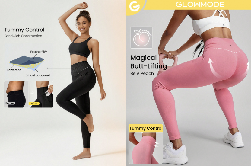 對于收腰提臀縮小腹這樣的硬實(shí)力,Glowmode宣傳起來絲毫不矜持,前后對比的手法令人不禁回憶起多年前那些一播一下午的電視購物廣告。