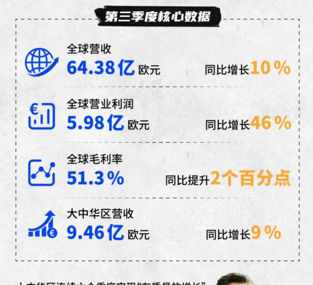 在中國市場,阿迪達(dá)斯同樣取得亮眼成績。作為阿迪達(dá)斯最為重要的戰(zhàn)略市場之一,大中華區(qū)業(yè)績穩(wěn)中有進(jìn),連續(xù)六個(gè)季度實(shí)現(xiàn)“有質(zhì)量的增長”。第三季度,大中華區(qū)營收達(dá)9.46億歐元,同比增長9%。