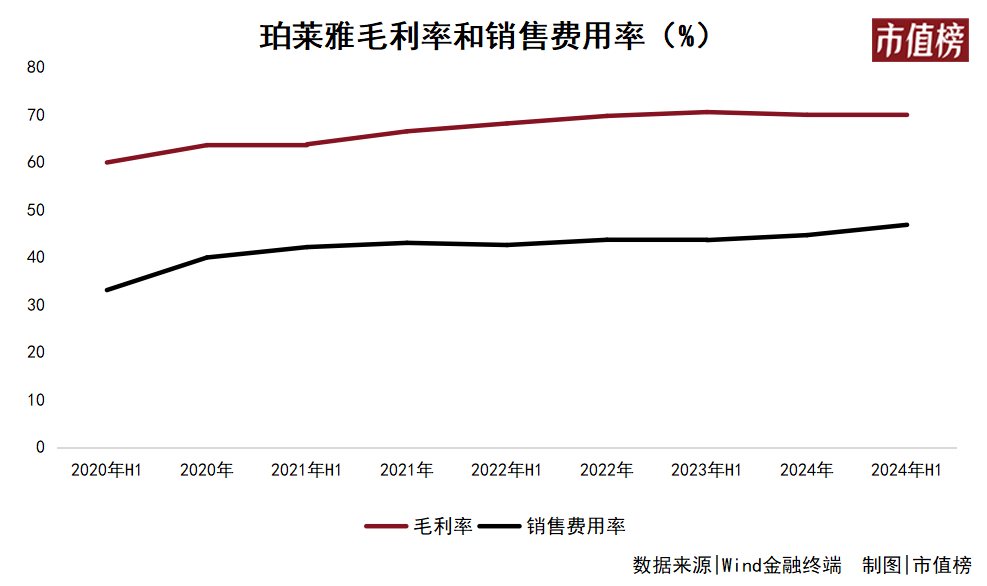 上美股份、珀萊雅的毛利率和他們各自的銷售費(fèi)用率的變動(dòng)很相似。