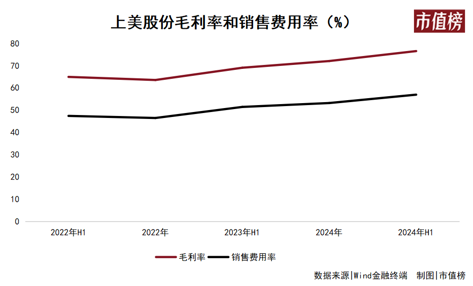 今年上半年,上美的銷售費(fèi)用率達(dá)到了57.6%,2022和2023同期,分別是48.2%和53.6%。兩年提升了近10個(gè)百分點(diǎn)。