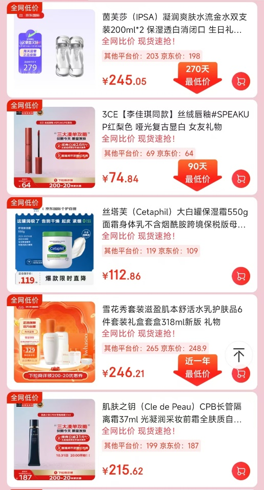 對于消費者而言,領(lǐng)再多的優(yōu)惠券也不如直接到手的真低價劃算。就比如京東國際推出的“超級美妝節(jié)”,打開京東APP搜索“美妝節(jié)”,就可以進入活動,里面展示了一系列能夠支持全網(wǎng)比價的美妝護膚和個人護理商品,能讓消費者省下不少心。