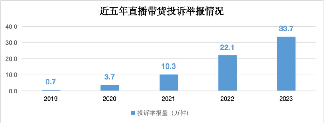 這也導致,直播電商行業(yè)的客訴量飛速攀升。據(jù)國家市場監(jiān)管總局披露的數(shù)據(jù)顯示,近五年來,中國直播電商市場規(guī)模增長10.5倍,直播帶貨投訴舉報量增幅高達47.1倍。
