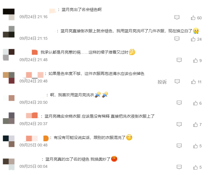 此事一出,不少網(wǎng)友在評(píng)論區(qū)寫下了自己的遭遇,“藍(lán)月亮直接倒衣服上就會(huì)褪色,我用藍(lán)月亮洗壞了幾件衣服,現(xiàn)在換立白了”,“藍(lán)月亮真的出了名的褪色,我換奧妙了”,“藍(lán)月亮出了名會(huì)褪色啊”。然而,也有網(wǎng)友覺(jué)得藍(lán)月亮不“背鍋”,“有沒(méi)有可能沒(méi)說(shuō)實(shí)話,跟別的衣服混洗了”,“我喜歡用藍(lán)月亮洗衣”。