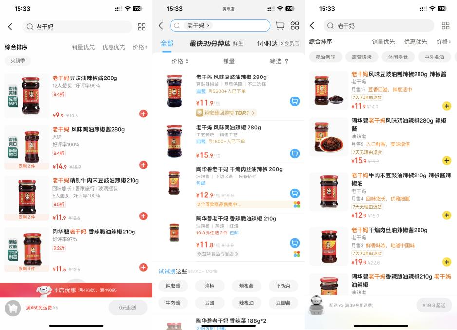 280克的老干媽豆豉油辣椒醬,京東七鮮賣9.9元,盒馬11.9元,小象超市11.9元。